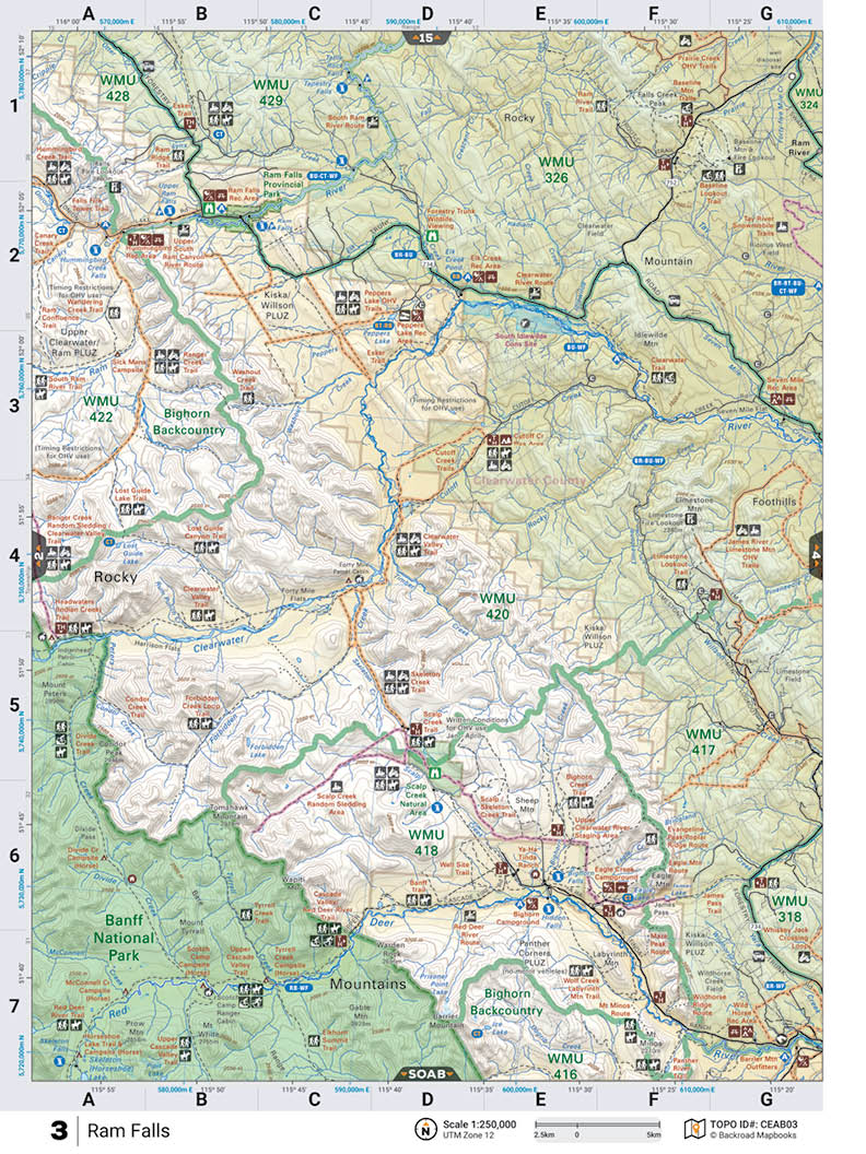 This recreation topographic map for Ram Falls highlights all the logging and resource roads, multi-use trails for hikers, mountain bikers, horseback riders, cross-country skiers and snowshoers, motorized trails for ATVers and snowmobiles, fishing lakes and rivers, recreation areas, campgrounds, day-use areas, viewpoints, backcountry campsites, work camps, oil & gas sites, backcountry huts and cabins and more. No other map for the area provides you with this level of recreational or topographic detail. Covering 3,040 km2 (1,175 mi2) in total, this 1:85,000 scale map measures 48 x 63.5 km (30 x 39.5 mi). Special features include enhanced oil & gas data plus countless roads, trails and recreational Points of Interest. This map includes Ram Falls, Ram Falls Provincial Park, Banff Nationa Park, Red Deer River, Clearwater River, Limestone Mountain and more!