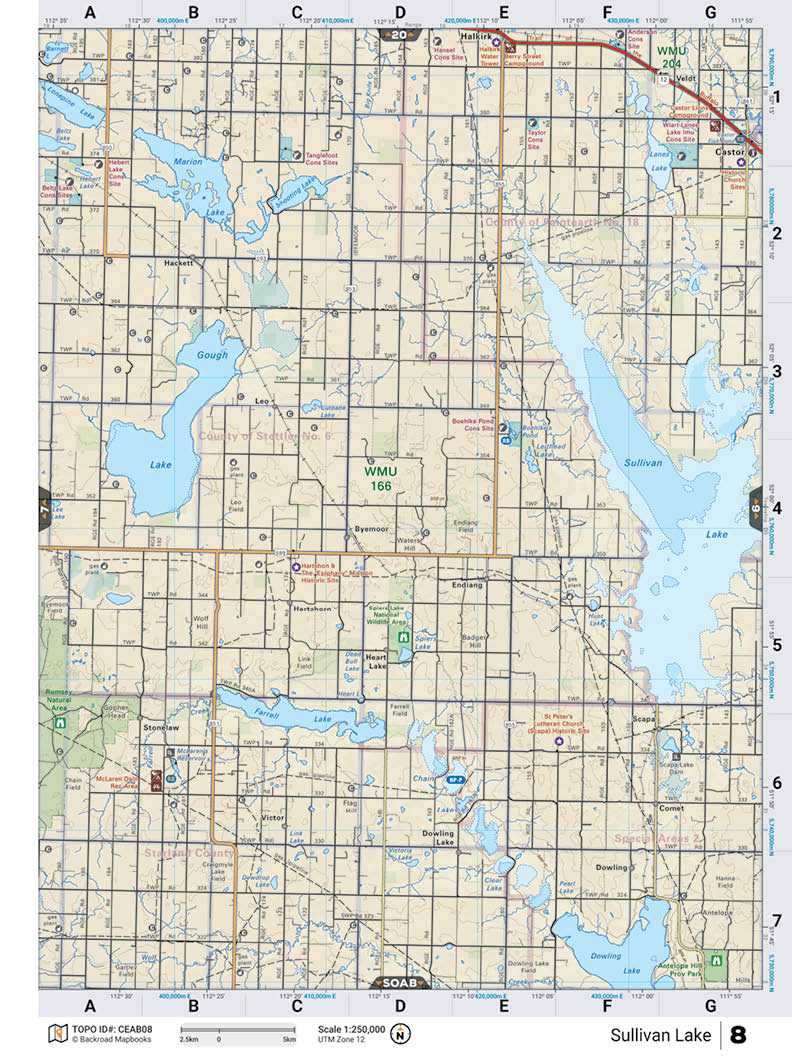 This recreation topographic map for Sullivan Lake highlights all the logging and resource roads, multi-use trails for hikers, mountain bikers, horseback riders, cross-country skiers and snowshoers, motorized trails for ATVers and snowmobiles, fishing lakes and rivers, recreation areas, campgrounds, day-use areas, viewpoints, backcountry campsites, work camps, oil & gas sites, backcountry huts and cabins and more. No other map for the area provides you with this level of recreational or topographic detail. Covering 3,040 km2 (1,175 mi2) in total, this 1:85,000 scale map measures 48 x 63.5 km (30 x 39.5 mi). Special features include enhanced oil & gas data plus countless roads, trails and recreational Points of Interest. This map includes Sullivan Lake, Gough Lake, Dowling Lake, Farrell Lake, Marion Lake, Castor, Heart Lake, Lonepine Lake, Halkirk, Battle River and more! This map also covers the following Wildlife Management Units: WMU 166 - Sullivan, WMU 204 - Paintearth. Sullivan Lake - Central Alberta is printed on demand at our office in Coquitlam (BC) and measures 61 x 94 cm (24 x 37 inches).