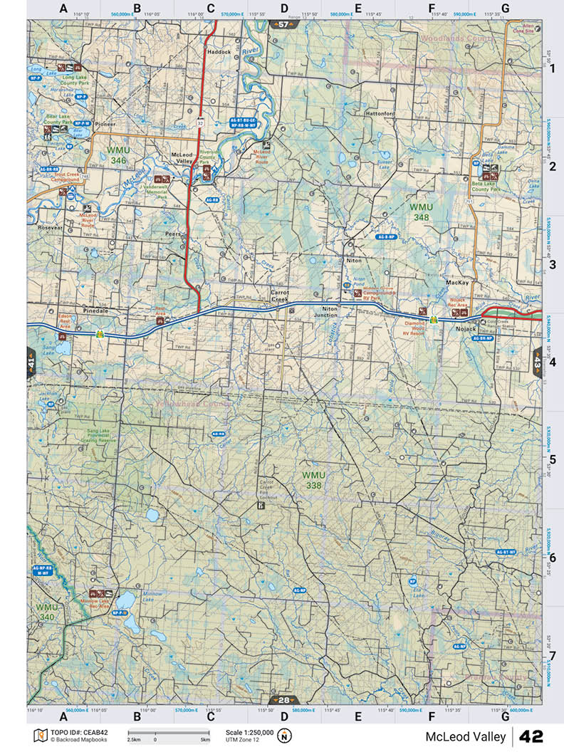 This recreation topographic map for McLeod Valley highlights all the logging and resource roads, multi-use trails for hikers, mountain bikers, horseback riders, cross-country skiers and snowshoers, motorized trails for ATVers and snowmobiles, fishing lakes and rivers, recreation areas, campgrounds, day-use areas, viewpoints, backcountry campsites, work camps, oil & gas sites, backcountry huts and cabins and more. No other map for the area provides you with this level of recreational or topographic detail. Covering 3,040 km2 (1,175 mi2) in total, this 1:85,000 scale map measures 48 x 63.5 km (30 x 39.5 mi). Special features include enhanced oil & gas data plus countless roads, trails and recreational Points of Interest. This map includes McLeod River, Minnow Lake, Shag Lake Grazing Reserve, Nojack, MacKay, Beta Lake County Park, McLeod Valley, Bear Lake County Park, Carrot Creek, Long Lake County Park and more! This map also covers the following Wildlife Management Units: WMU 338 - Carrot Creek, WMU 340 - Wolf River, WMU 346 - Shiningbank, WMU 348 - Chip Lake. McLeod Valley - Central Alberta comes in both Print and Digital Versions.