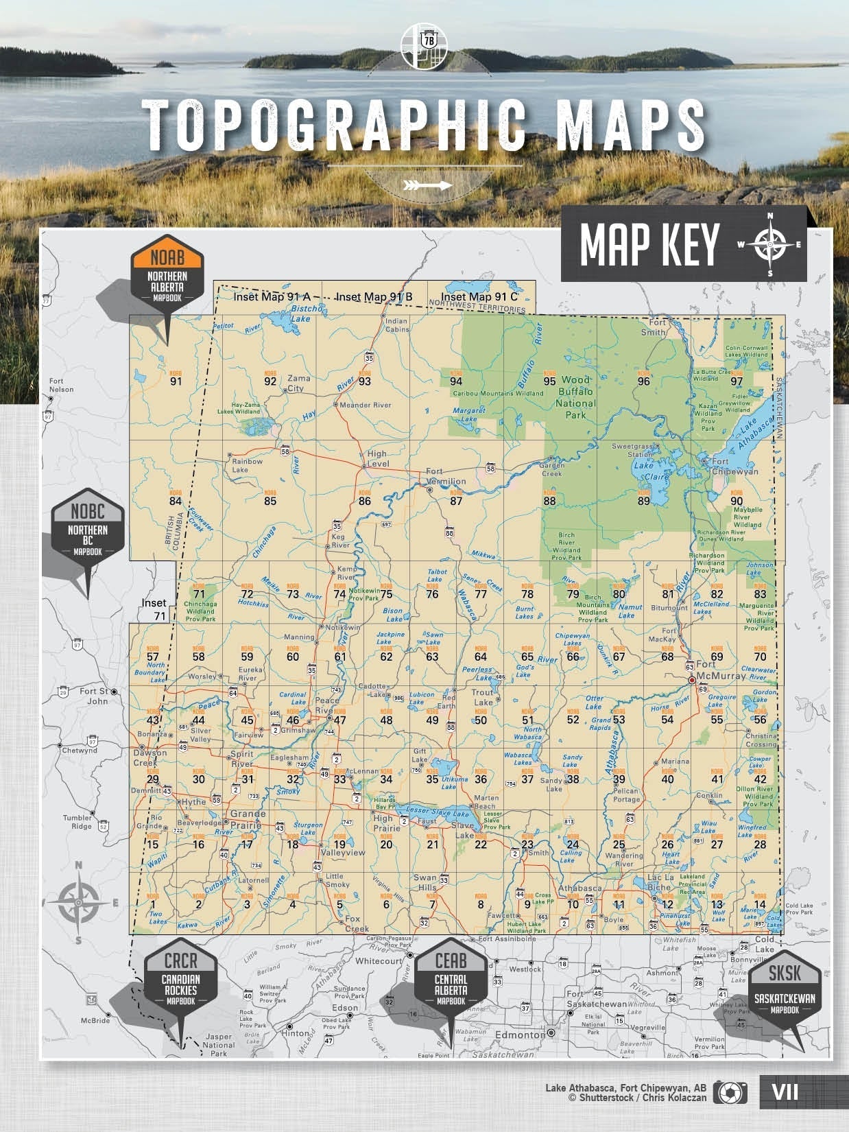 In your durable, heavy-duty, spiral-bound 21.5 x 26 cm (8.5 x 11 in) Northern Alberta Backroad Mapbook you will find 97 detailed topographic maps spanning the region, complete with labelled campgrounds, amenities, highways, backcountry roads, trails and other Points of Interest. These user-friendly maps boast a level of cartographic sophistication unparalleled even by government sources, making them the maps of choice for Oil & Gas workers and Search and Rescue teams.