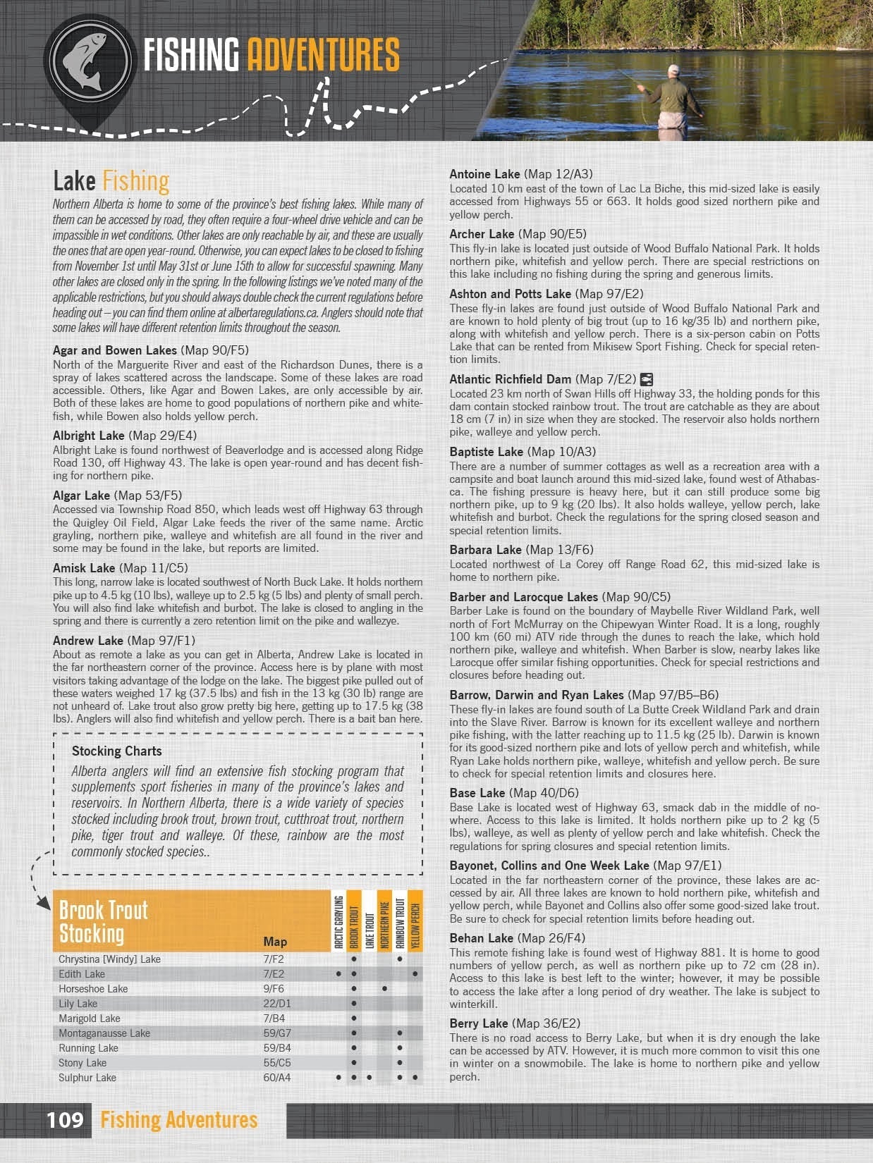 Fishing AdventuresHome to over half of Alberta's fish bearing lakes, Northern Alberta has a well-earned reputation as an excellent place to fish. From easy-access roadside lakes and rivers to remote fly-in lakes that rarely see a line, there is something for every angler in Northern Alberta. Your Northern Alberta Backroad Mapbook contains close to 370 of the region's best fishing lakes, rivers and streams, complete with information on species, stocking, access, regulations and more. From the waters of Bistcho Lake to Lake Athabasca, Iosegun Lake, Peerless Lake, the Little Smoky River, Peace River and beyond, we've got you covered.