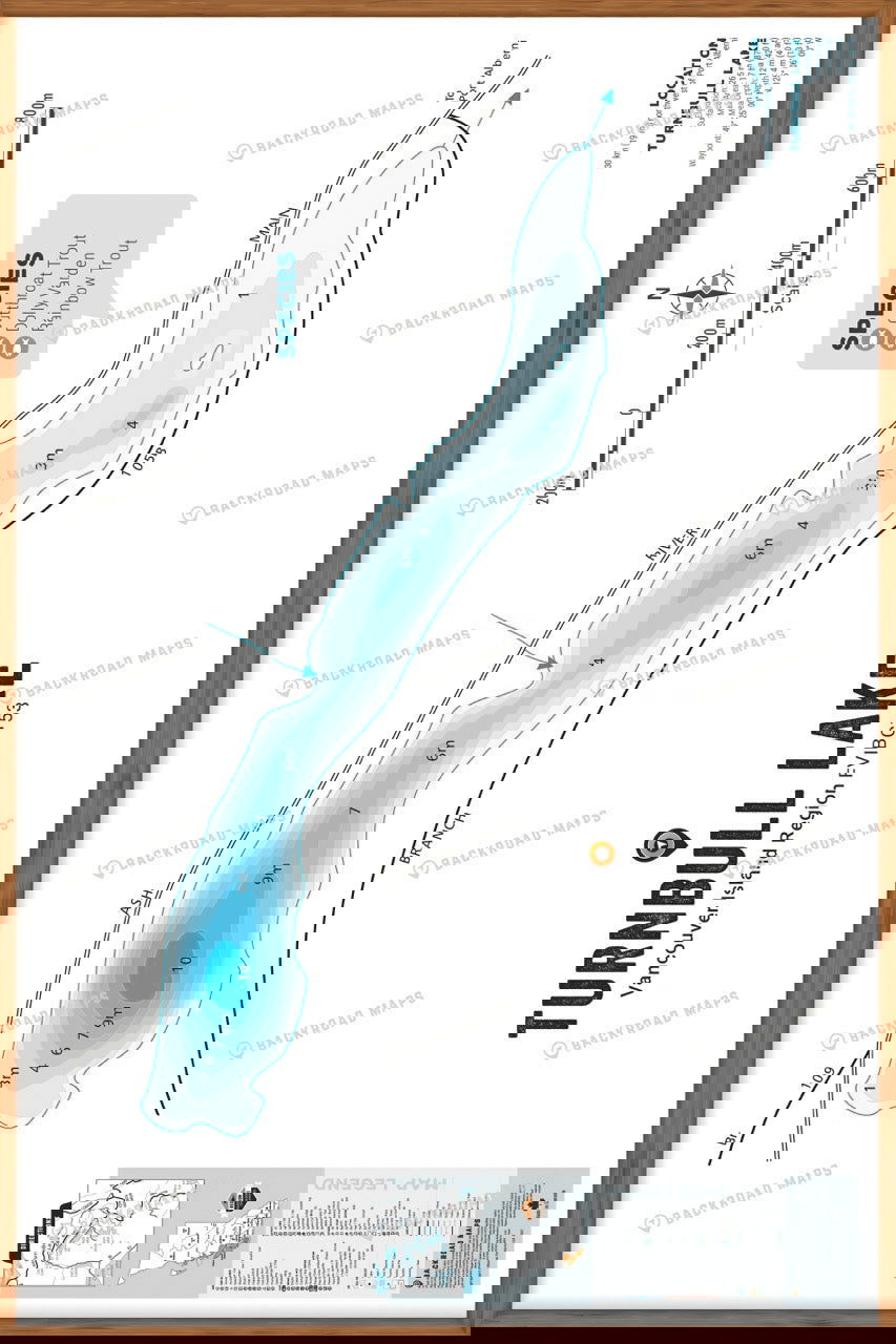This Fishing Chart covers Turnbull Lake on Vancouver Island, BC. Resting in BC Fishing Region 1, the map features the lake bathymetry (or lake depths) and shore features including boat launches, campsites, fishing docks, parks and resorts. In addition to road or trail access points, the map also includes the lake location and information such as elevation, surface area, mean and maximum depth, and waypoint. Additional features include the fish species found in the lake, an area indicator or map key, scale bar and map legend.