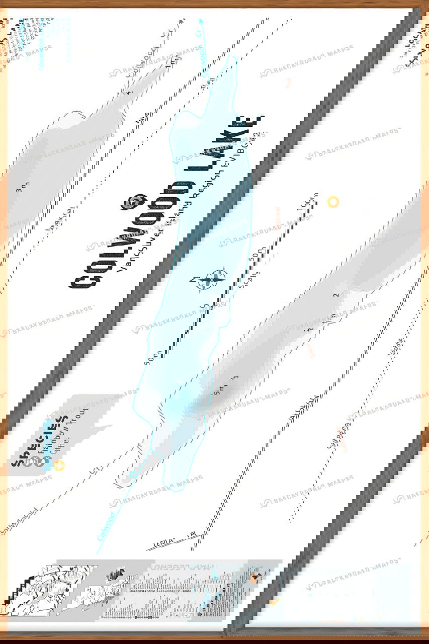 This Fishing Chart covers Colwood Lake on Vancouver Island, BC. Resting in BC Fishing Region 1, the map features the lake bathymetry (or lake depths) and shore features including boat launches, campsites, fishing docks, parks and resorts. In addition to road or trail access points, the map also includes the lake location and information such as elevation, surface area, mean and maximum depth, and waypoint. Additional features include the fish species found in the lake, an area indicator or map key, scale bar and map legend.