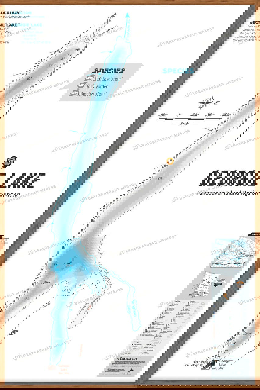 This Fishing Chart covers Georgie Lake on Vancouver Island, BC. Resting in BC Fishing Region 1, the map features the lake bathymetry (or lake depths) and shore features including boat launches, campsites, fishing docks, parks and resorts. In addition to road or trail access points, the map also includes the lake location and information such as elevation, surface area, mean and maximum depth, and waypoint. Additional features include the fish species found in the lake, an area indicator or map key, scale bar and map legend.