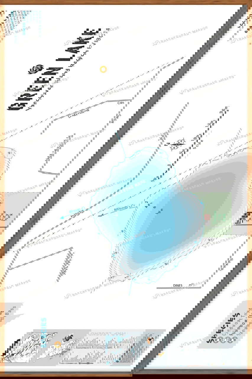 This Fishing Chart covers Green Lake on Vancouver Island, BC. Resting in BC Fishing Region 1, the map features the lake bathymetry (or lake depths) and shore features including boat launches, campsites, fishing docks, parks and resorts. In addition to road or trail access points, the map also includes the lake location and information such as elevation, surface area, mean and maximum depth, and waypoint. Additional features include the fish species found in the lake, an area indicator or map key, scale bar and map legend.