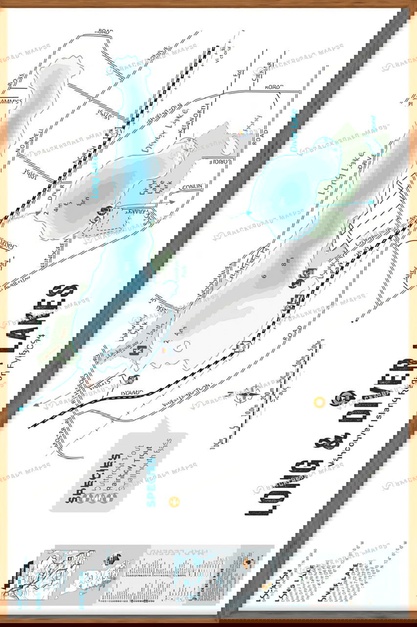 This Fishing Chart covers Long & Diver Lakes on Vancouver Island, BC. Resting in BC Fishing Region 1, the map features the lake bathymetry (or lake depths) and shore features including boat launches, campsites, fishing docks, parks and resorts. In addition to road or trail access points, the map also includes the lake location and information such as elevation, surface area, mean and maximum depth, and waypoint. Additional features include the fish species found in the lake, an area indicator or map key, scale bar and map legend.