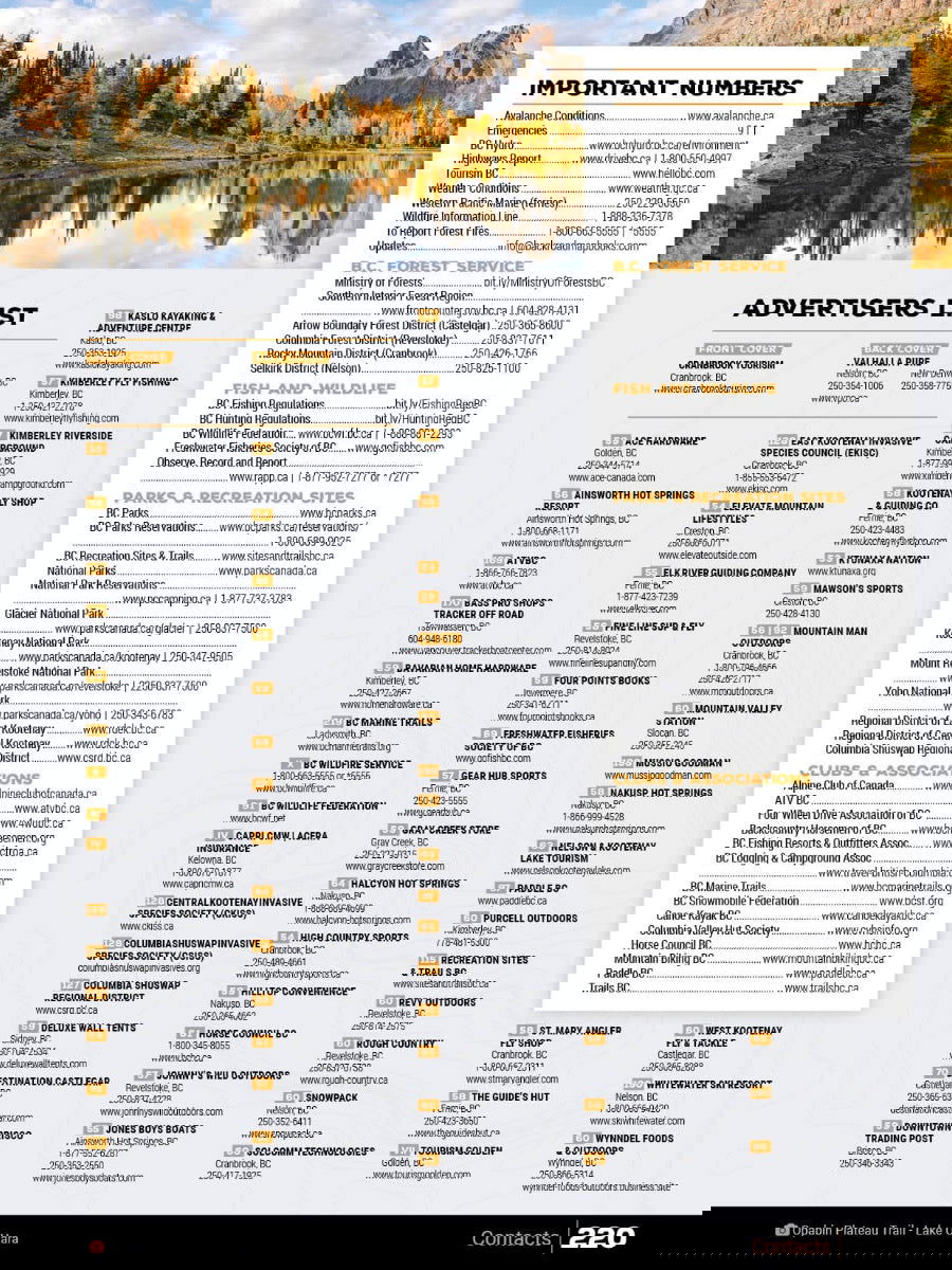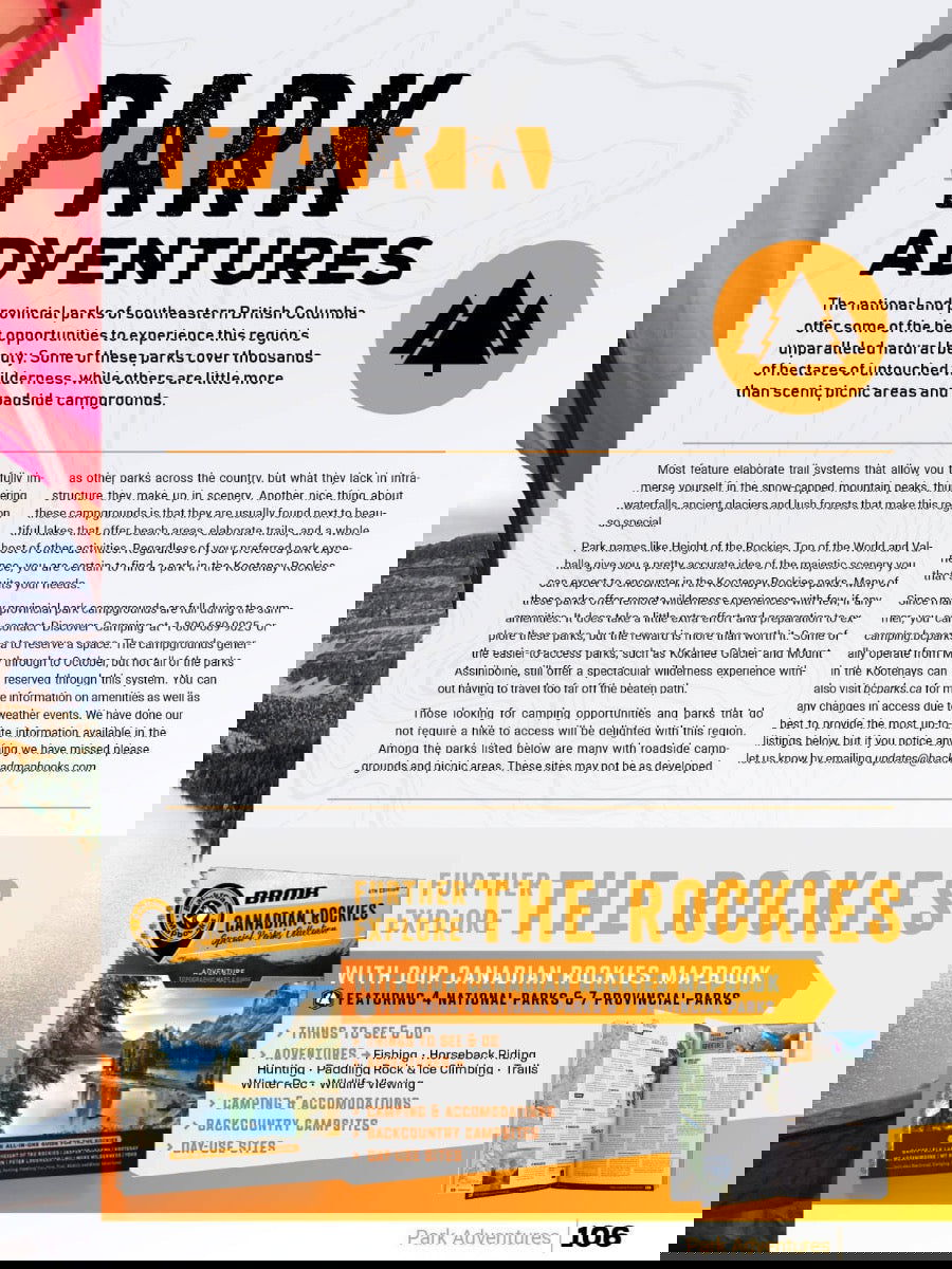 The Kootenay Rockies region offers a network of National, Provincial, and Regional Parks that protect some of Canadaâ_x0080__x0099_s most stunning natural landscapes. Towering mountain peaks, valleys filled with wildflowers, turquoise lakes, and rushing rivers provide habitat for a variety of wildlife. In the latest edition of our Kootenay Rockies Backroad Mapbook, you will find over 100 updated listings with detailed descriptions of Provincial, National, and Regional Parks along with notable amenities, easy-to-read activity symbols, camping or day-use information, park access and more.