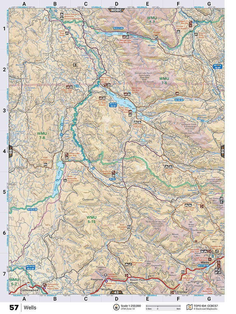 This recreation topographic map for the Wells area highlights all the logging roads, trails and recreational Points of Interest including hunting, camping, hiking, mountain biking, canoeing, kayaking, backcountry skiing, wildlife viewing, ATVing, snowmobiling and more. No other map provides you with this level of recreational and topographic detail for the Homathko River area. Covering the Wells, Ahbau Lake, Pine Grove, Cottonwood, Stony Lake, Narrow Lake, Bowron River, Two Sisters Mtn, Cow Mtn, Willow River and more, this map contains new features such as private land and labelled fish species. The 1:85,000 scale map covers 3,040 km2 (1,175 mi2), measuring 50 x 63.5 km (30 x 39.5 mi).