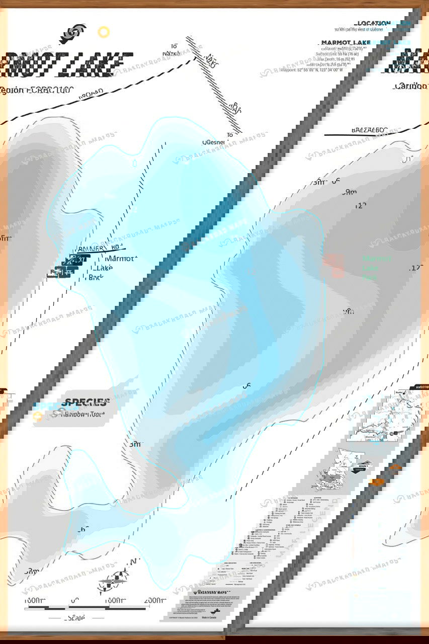 This Fishing Chart covers Marmot Lake on Cariboo Region, BC. Resting in BC Fishing Region 5, the map features the lake bathymetry (or lake depths) and shore features including boat launches, campsites, fishing docks, parks and resorts. In addition to road or trail access points, the map also includes the lake location and information such as elevation, surface area, mean and maximum depth, and waypoint. Additional features include the fish species found in the lake, an area indicator or map key, scale bar and map legend.