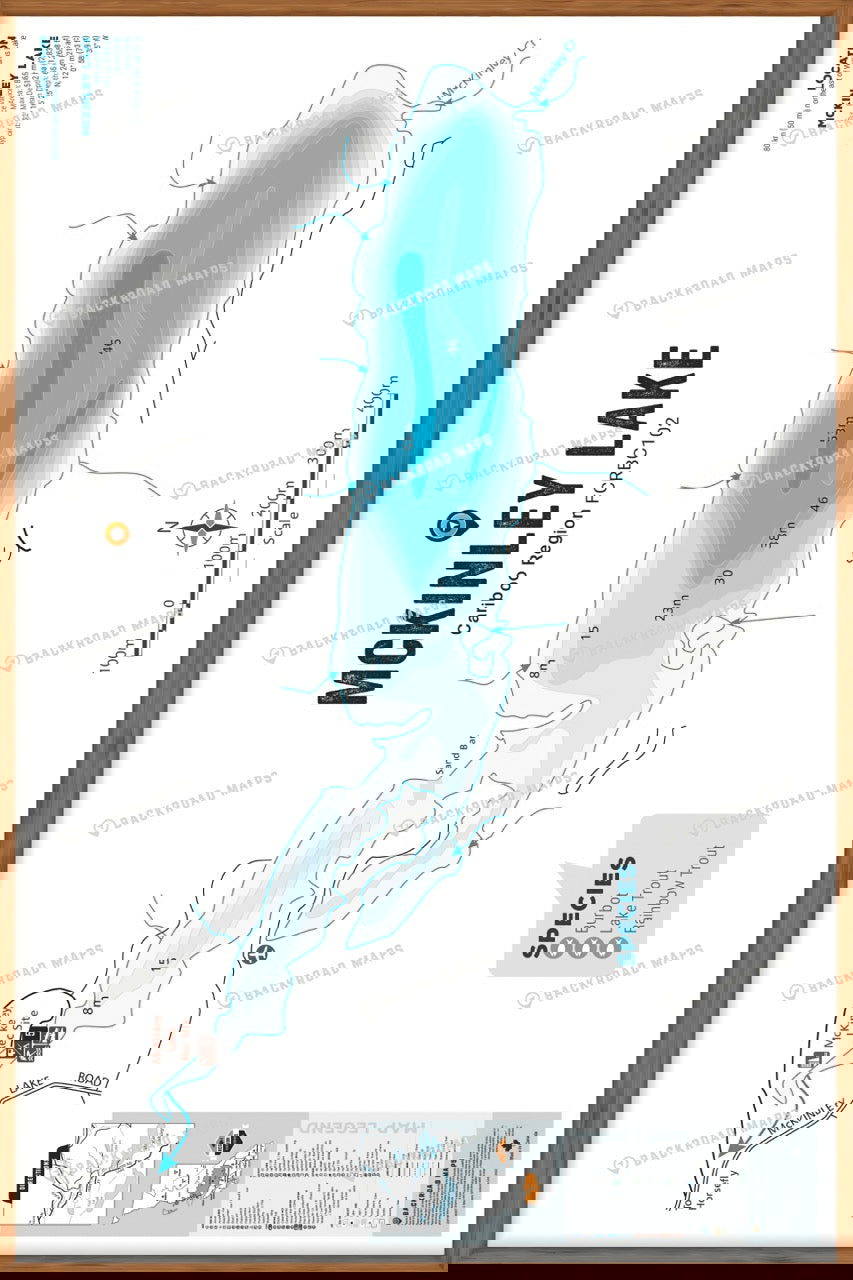 This Fishing Chart covers McKinley Lake on Cariboo Region, BC. Resting in BC Fishing Region 5, the map features the lake bathymetry (or lake depths) and shore features including boat launches, campsites, fishing docks, parks and resorts. In addition to road or trail access points, the map also includes the lake location and information such as elevation, surface area, mean and maximum depth, and waypoint. Additional features include the fish species found in the lake, an area indicator or map key, scale bar and map legend.