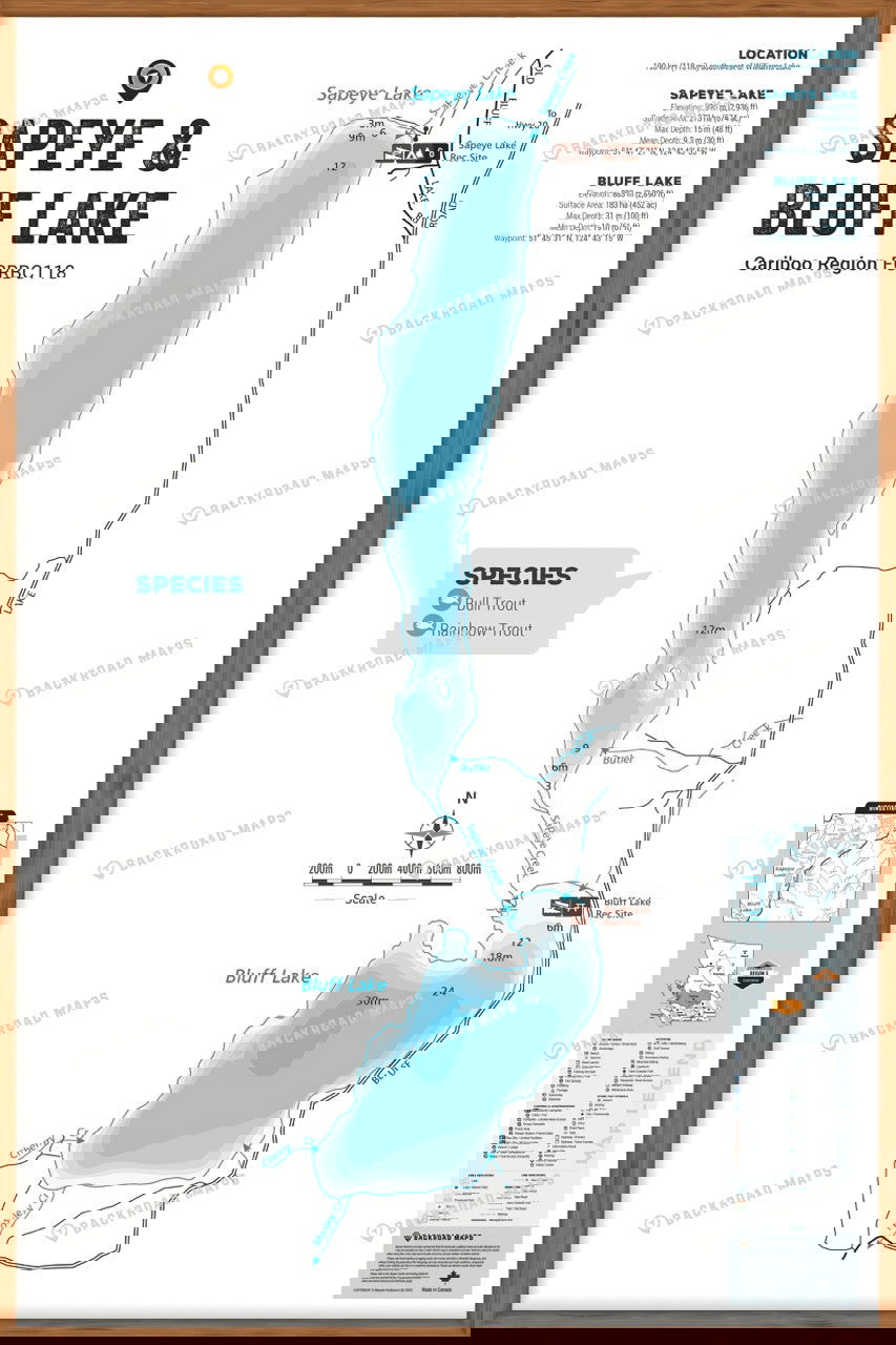 This Fishing Chart covers Sapeye & Bluff on Cariboo Region, BC. Resting in BC Fishing Region 5, the map features the lake bathymetry (or lake depths) and shore features including boat launches, campsites, fishing docks, parks and resorts. In addition to road or trail access points, the map also includes the lake location and information such as elevation, surface area, mean and maximum depth, and waypoint. Additional features include the fish species found in the lake, an area indicator or map key, scale bar and map legend.