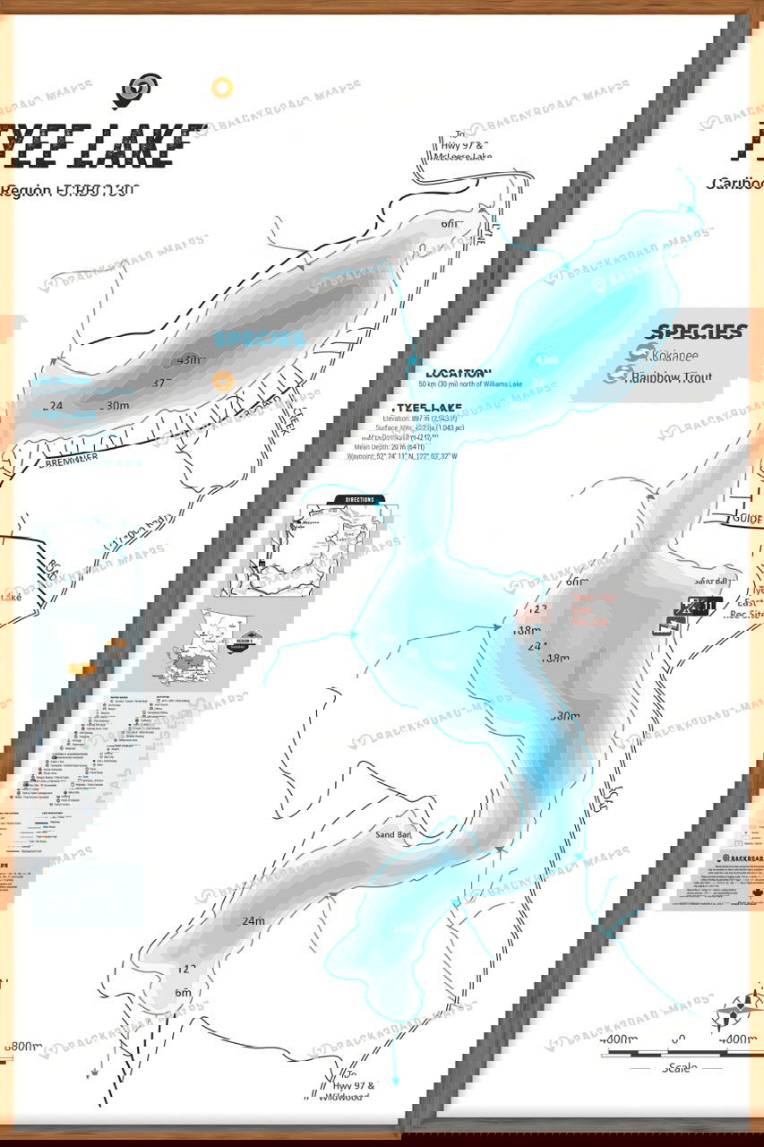 This Fishing Chart covers Tyee Lake on Cariboo Region, BC. Resting in BC Fishing Region 5, the map features the lake bathymetry (or lake depths) and shore features including boat launches, campsites, fishing docks, parks and resorts. In addition to road or trail access points, the map also includes the lake location and information such as elevation, surface area, mean and maximum depth, and waypoint. Additional features include the fish species found in the lake, an area indicator or map key, scale bar and map legend.