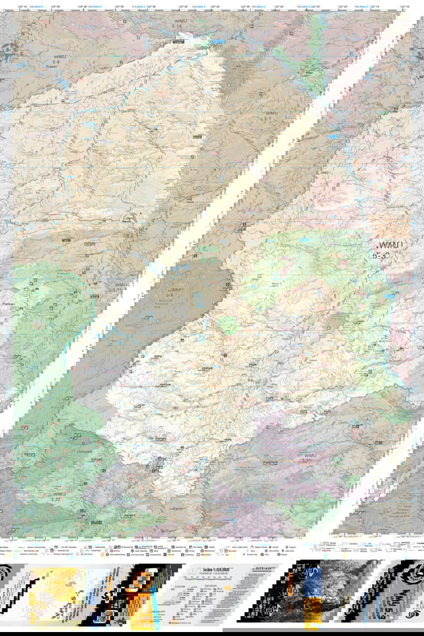 This topographic hunting map covers Wildlife Management Unit 5-3 in Cariboo region British Columbia. Featuring 1:20,000 scale water and road data from the popular Backroad Mapbook series, the maps clearly mark Wildlife Management Units, along with private land areas, Indian reserves and park areas. Updated road and trail systems, recreational points of interest, campsites, fish species and more make these the most detailed hunting maps available on the market. WMU 5-3 is bounded on three sides by the Fraser and Chilcotin Rivers and Big Creek and contains the Churn Creek Protected Area and Gang Ranch.
