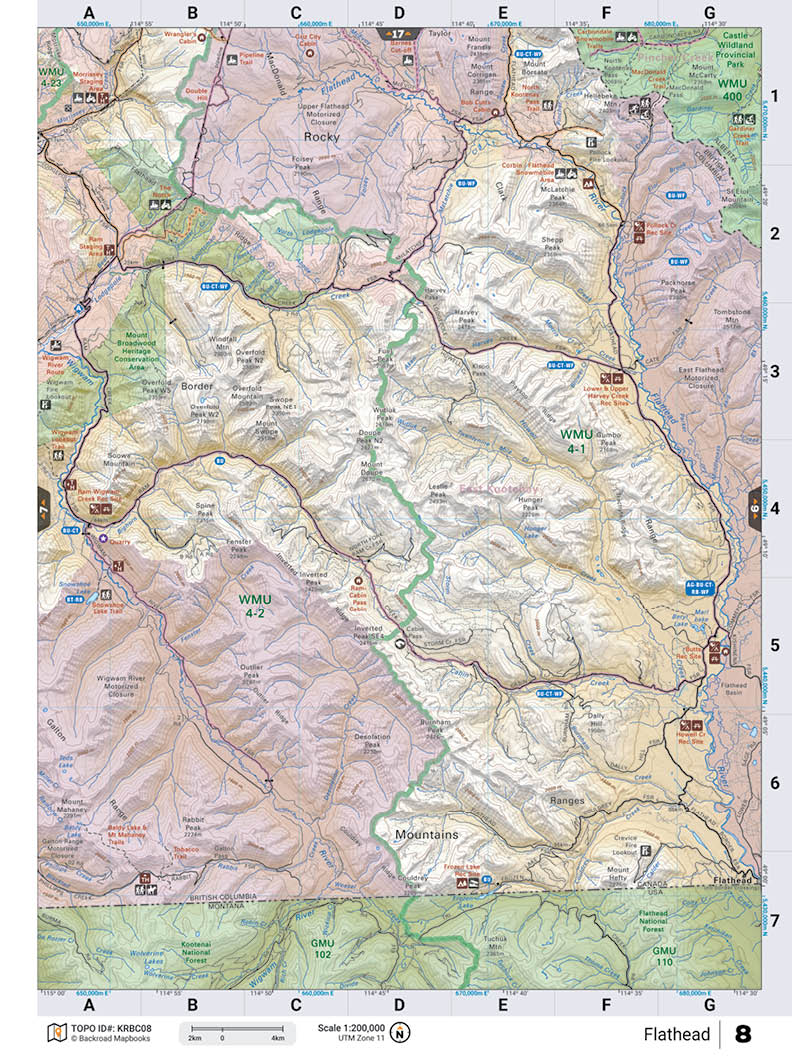 This recreation topographic map for the Flathead area highlights all the logging and resource roads, multi-use trails for hikers, mountain bikers, horseback riders, cross-country skiers and snowshoers, motorized trails for ATVers and snowmobiles, fishing lakes and rivers, recreation areas, campgrounds, day-use areas, viewpoints, backcountry campsites, backcountry huts and cabins and more. No other map for the area provides you with this level of recreational or topographic detail. Special features include private land, labelled fish species and countless roads, trails and recreational Points of Interest. Covering 1,950 km2 (753 mi2), this 1:65,000 scale map measures 38 x 51 km (23.5 x 32 mi). This map includes Mount Broadwood Heritage Conservation Area, Castle Special Management Area, Flathead River, Snowshoe Lake, Flathead, Hellebeke Mtn and more! This map also covers the following Wildlife Management Units: WMU 4-1 Kootenay, WMU 4-23 Kootenay, WMU 4-2 Kootenay. Flathead - Kootenay Rockies BC is printed on demand at our office in Coquitlam (BC) and measures 61 x 94 cm (24 x 37 inches).