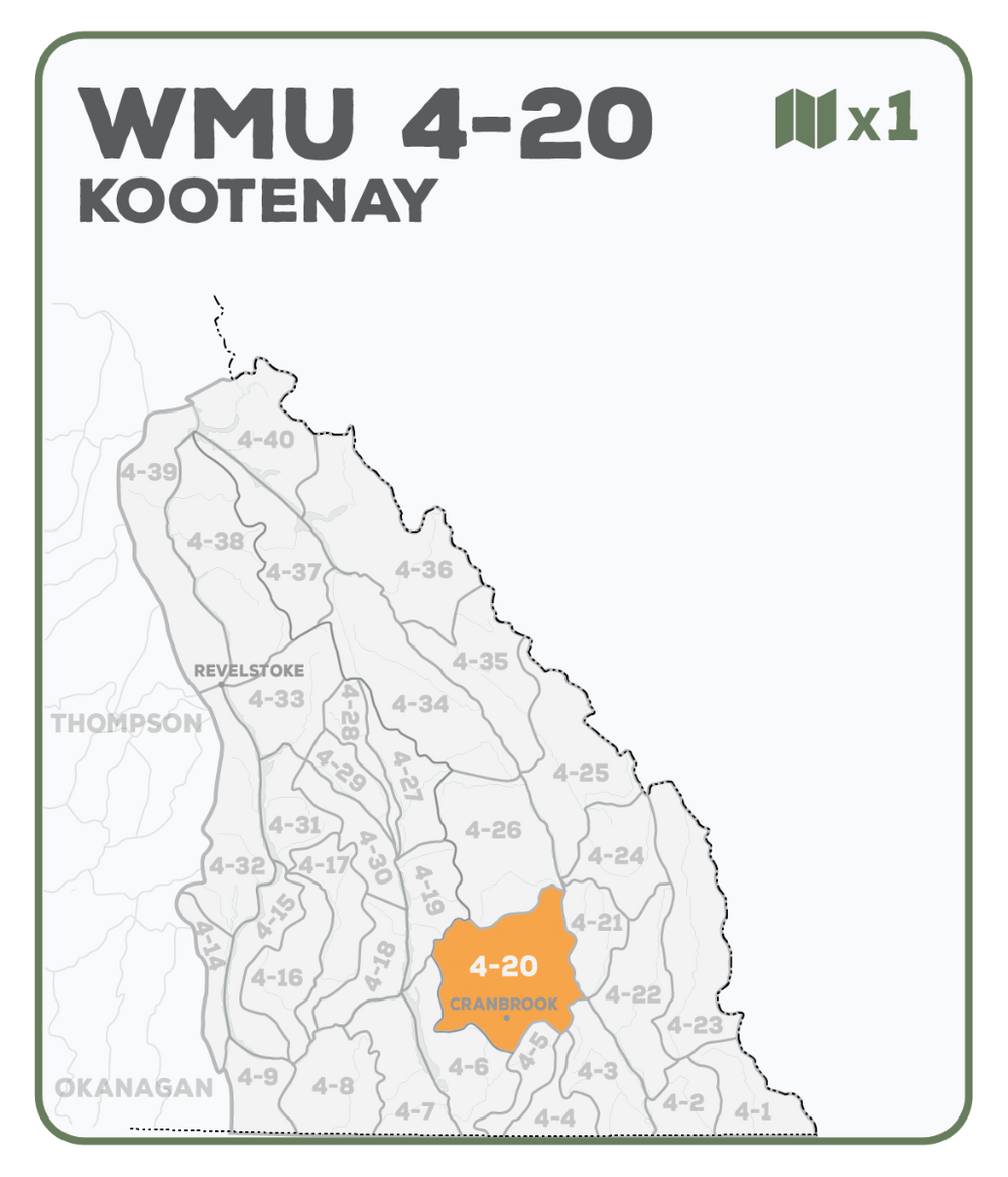 WMU 4-20 Kootenay Region - Hunting Topo BC This topographic hunting map covers Wildlife Management Unit 4-20 in Kootenay region British Columbia. Featuring 1:20,000 scale water and road data from the popular Backroad Mapbook series, the maps clearly mark Wildlife Management Units, along with private land areas, Indian reserves and...