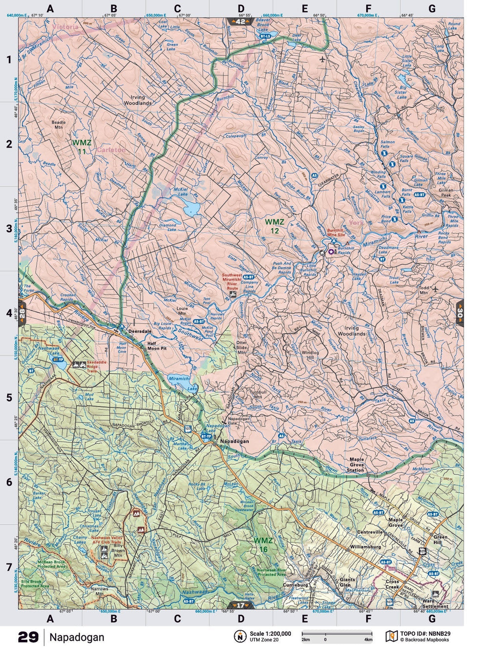 This recreation topographic map for Napadogan highlights all the logging/resource roads, hunting areas, fishing lakes & streams, campsites, paddling routes for canoeing and kayaking, wildlife viewing areas, multi-use trails for hiking, biking, horseback riding, cross-country skiing and snowshoeing, motorized trails for ATVing and snowmobiling & more. Covering 1,950 km2 (750 mi2), this 1:65,000 scale map measures 38 x 51 km (23.5 x 32 mi), providing you with more topographic and recreational detail for the Grand Manan Island area than any other map on the market. New features include enhanced Crown land data and countless updates to roads, trails and recreational Points of Interest. This map includes Napadogan, Maple Grove, Currieburg, Miramichi Lake, McKiel Lake, Nashwaak Lake, Southwest Miramichi River, Green Hill, Cross Creek, Beaver Brook Lake and more!