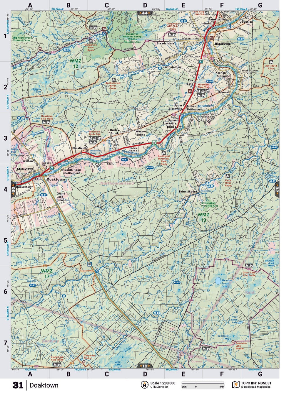 This recreation topographic map for Doaktown highlights all the logging/resource roads, hunting areas, fishing lakes & streams, campsites, paddling routes for canoeing and kayaking, wildlife viewing areas, multi-use trails for hiking, biking, horseback riding, cross-country skiing and snowshoeing, motorized trails for ATVing and snowmobiling & more. Covering 1,950 km2 (750 mi2), this 1:65,000 scale map measures 38 x 51 km (23.5 x 32 mi), providing you with more topographic and recreational detail for the Grand Manan Island area than any other map on the market. New features include enhanced Crown land data and countless updates to roads, trails and recreational Points of Interest. This map includes Southwest Miramichi River, Cains River, Doaktown, Blackville, Blissfield, Shinnickburn, Gaspereau River, Coughlan, Bartholomew River, Meadow Brook Lake and more!