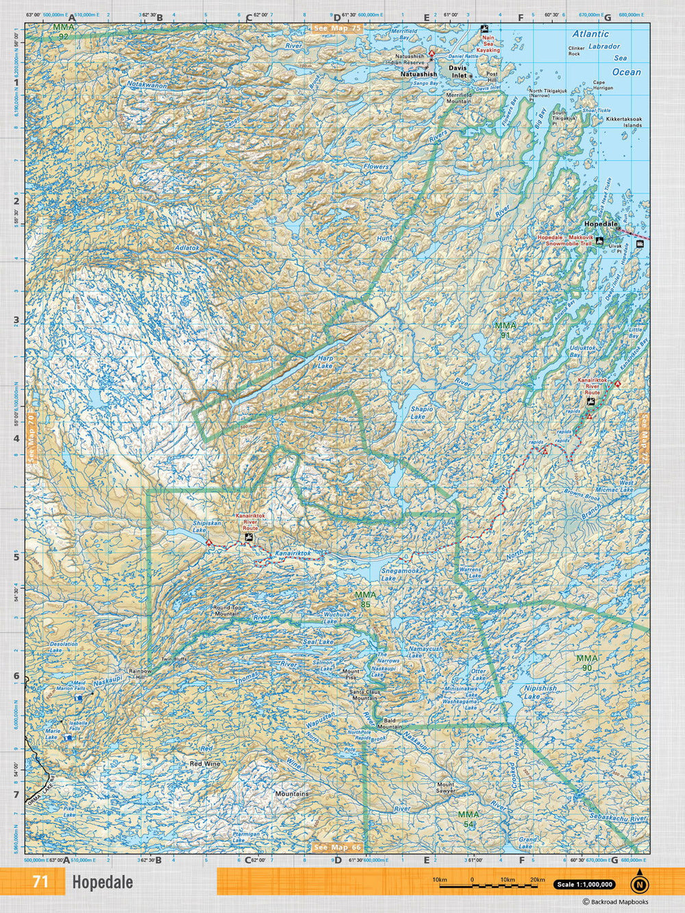 This recreation topographic map for Hopedale Labrador highlights all the logging/resource roads, hunting areas, fishing lakes & streams, campsites, paddling routes for canoeing and kayaking, wildlife viewing areas, multi-use trails for hiking, biking, horseback riding, cross-country skiing and snowshoeing, motorized trails for ATVing and snowmobiling & more. Covering 49,475 km2 (19,100 mi2), this 1:330,000 scale map measures 193 x 256.5 km (120 x 159 mi), providing you with more topographic and recreational detail for the Fortune area than any other map on the market. Special features include countless roads, trails and recreational Points of Interest. Included on this map are Hopedale, Harp Lake, Adlatok River, Hunt River, Sebaskchu River, Nipishish Lake, Shapiro Lake, Flowers River and more!