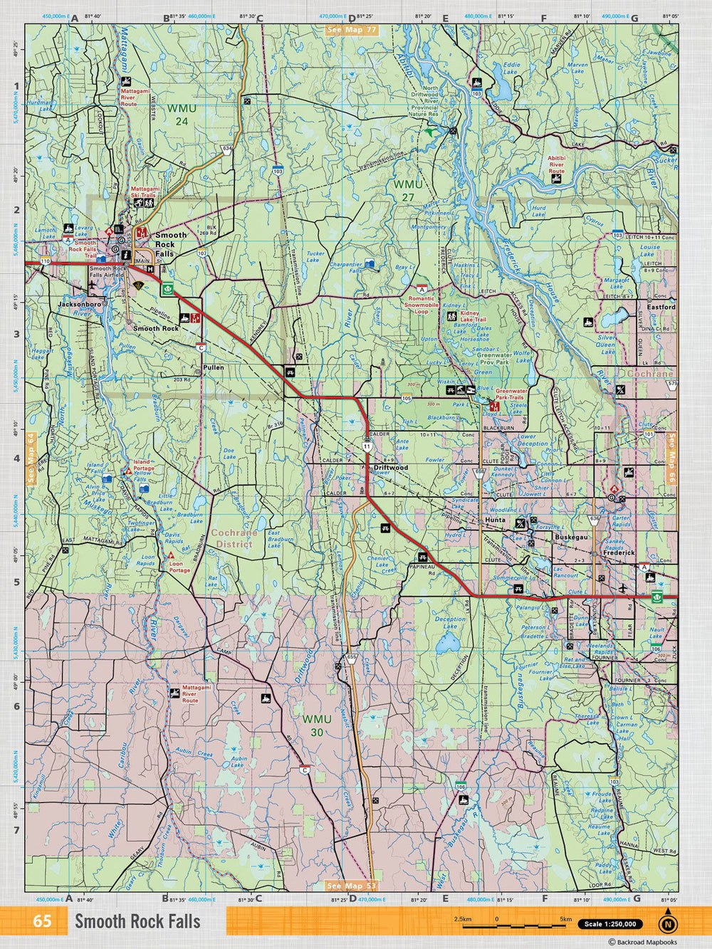 This recreation topographic map for Smooth Rock Falls highlights all the logging/resource roads, hunting areas, fishing lakes & streams, campsites, paddling routes for canoeing and kayaking, wildlife viewing areas, multi-use trails for hiking, biking, horseback riding, cross-country skiing and snowshoeing, motorized trails for ATVing and snowmobiling & more. Covering 3,040 km2 (1,170 mi2), this 1:85,000 scale map measures 48 x 63.5 km (30 x 39.5 mi), providing you with more topographic and recreational detail for the Meldrum Bay area than any other map on the market. New features include Crown land areas, countless new roads and trails plus additional recreational Points of Interest. Included on this map are Smooth Rock Falls, Abitibi River, Frederick House River, Greenwater Prov Park, Eddie Lake, Jacksonboro, Muskego River, Mattagami River, Deception Lake, Driftwood and more!