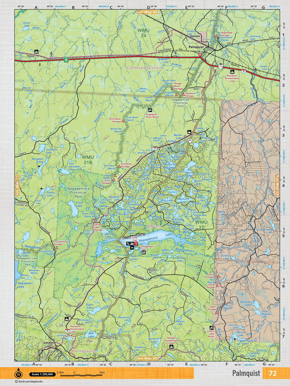 This recreation topographic map for Palmquist highlights all the logging/resource roads, hunting areas, fishing lakes & streams, campsites, paddling routes for canoeing and kayaking, wildlife viewing areas, multi-use trails for hiking, biking, horseback riding, cross-country skiing and snowshoeing, motorized trails for ATVing and snowmobiling & more. Covering 3,040 km2 (1,170 mi2), this 1:85,000 scale map measures 48 x 63.5 km (30 x 39.5 mi), providing you with more topographic and recreational detail for the Meldrum Bay area than any other map on the market. New features include Crown land areas, countless new roads and trails plus additional recreational Points of Interest. Included on this map are Palmquist, Shekak River, Nagagamisis Lake, Nagagamisis Provincial Park, Nagagami Lake Provincial Park and more!
