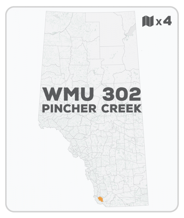 This hunting map bundle includes four individual topographic maps covering this zone. Printed at a 1:75,000 scale, these maps feature clearly marked Wildlife Management Units, along with Crown land areas, provincial grazing reserves and public land use zones. Updated road and trail systems, recreational points of interest, campsites, fish species and more make these the most detailed hunting maps available on the market. WMU 302 is located southwest of Pincher Creek and is bordered by Highway 3 to the north, Highway 6 to the east and Drywood Creek in the south.
