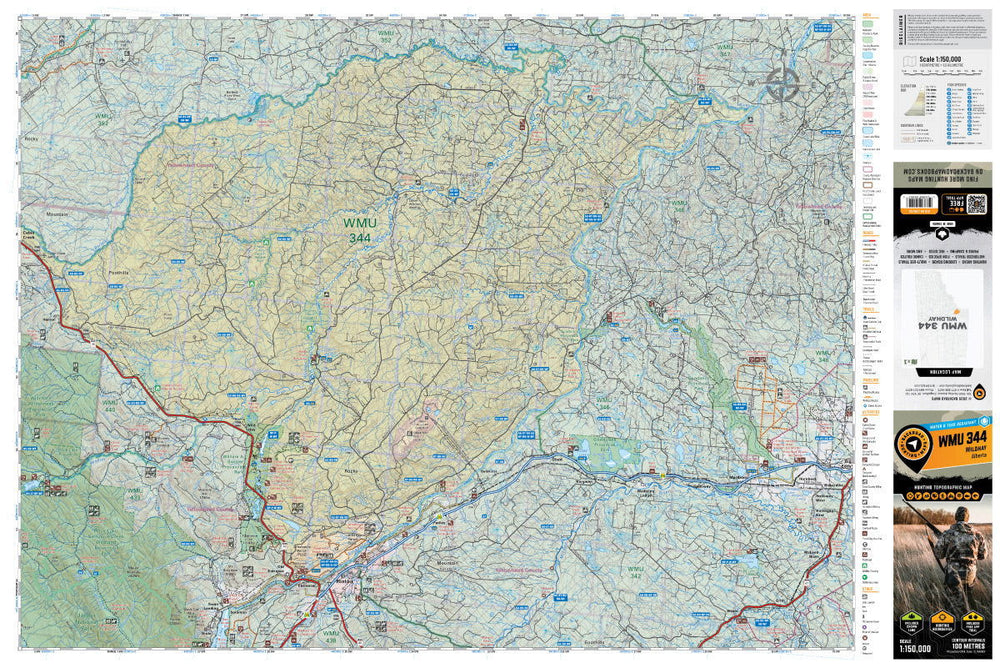 This topographic hunting map covers the Wildhay area Wildlife Management Unit 344 in central Alberta. Featuring 1:50,000 scale water and road data from the popular Backroad Mapbook series, the maps clearly mark Wildlife Management Units, along with, Crown land areas, provincial grazing reserves and public land use zones. Updated road and trail systems, recreational points of interest, campsites, fish species and more make these the most detailed hunting maps available on the market. WMU 344 covers the area between Forestry Trunk Road 40 near Cabin Creek and Berland Rivers confluence in the west to the confluence of the Berland River at the Athabasca River in the north east south to Hinton.