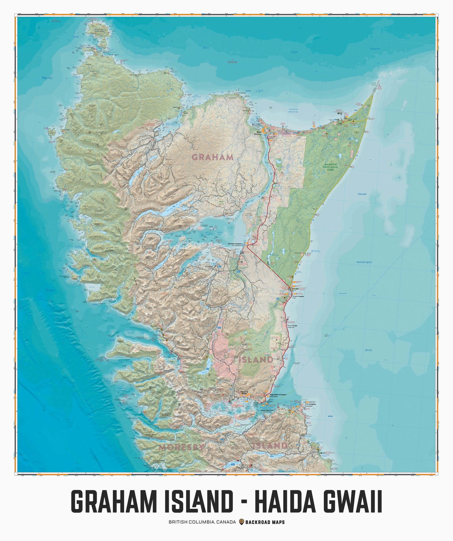 Covering all of Graham Island on Haida Gwaii, this custom designed map has been created to display nicely on your home, cabin or office wall. The map has been produced using the ever-popular Backroad Mapbook series of maps and showcases this popular area of British Columbia, Canada like never before. Featuring all the roads, trails and recreational hot spots in and around Graham Island, this map has been modified to fit nicely into common picture frame sizes. Printed on a durable synthetic material, the map includes Graham Island, Haida, Langara Island, Masset, Naden Harbour, Naikoon Provincial Park, Port Clements, Queen Charlotte City, Rennell Sound, Sandspit, Skidegate, Tlell and more!