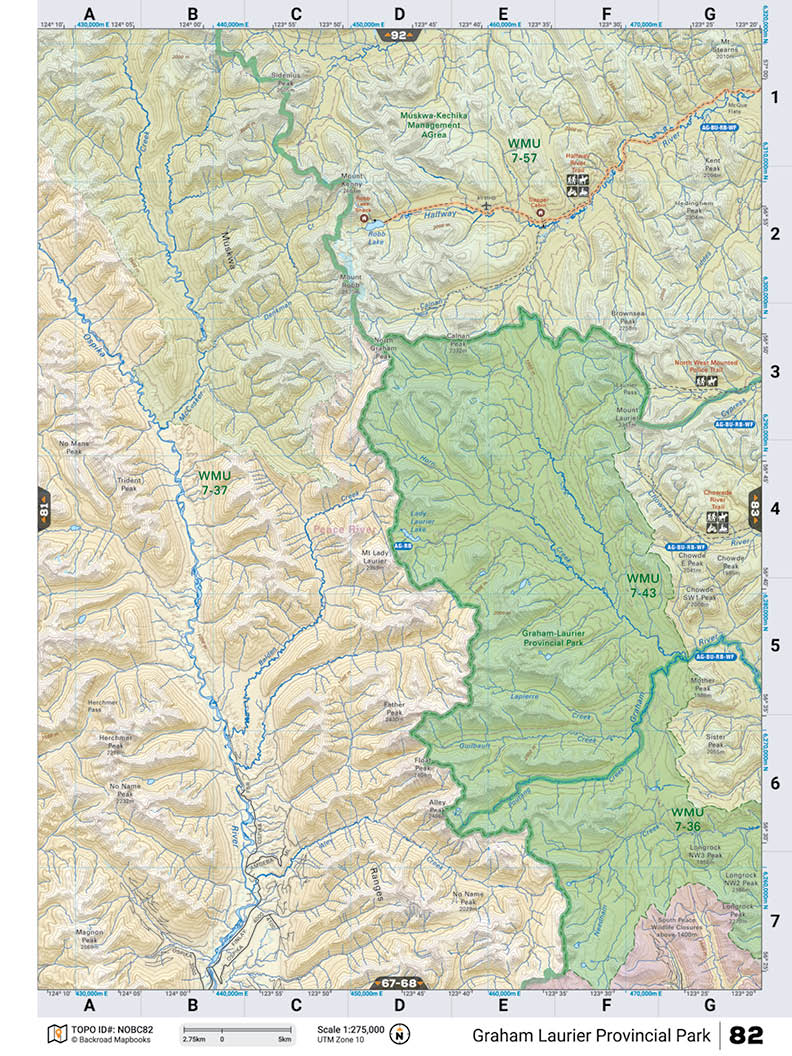 This recreation topographic map for the Graham Laurier Provincial Park area highlights all the logging and resource roads, recreational features and trails for hiking, mountain biking, ATVing, snowmobiling, skiing, snowshoeing, fishing, camping, hunting, canoeing, kayaking, wildlife viewing and more. New features include private land and labelled fish species, plus new roads, recreational trails and Points of Interest. No other map for the area provides you with this level of recreational or topographic detail. Measuring 52.5 x 70 km (32.5 x 43.5 mi), this 1:90,000 scale map covers 3,680 km2 (1,420 mi2) in total and includes Graham - Laurier Provincial Park, Muskwa-Kechika Management Area, Ospika River, Halfway River, Graham River, Lady Laurier Lake, Robb Lake, Chowade River and more!