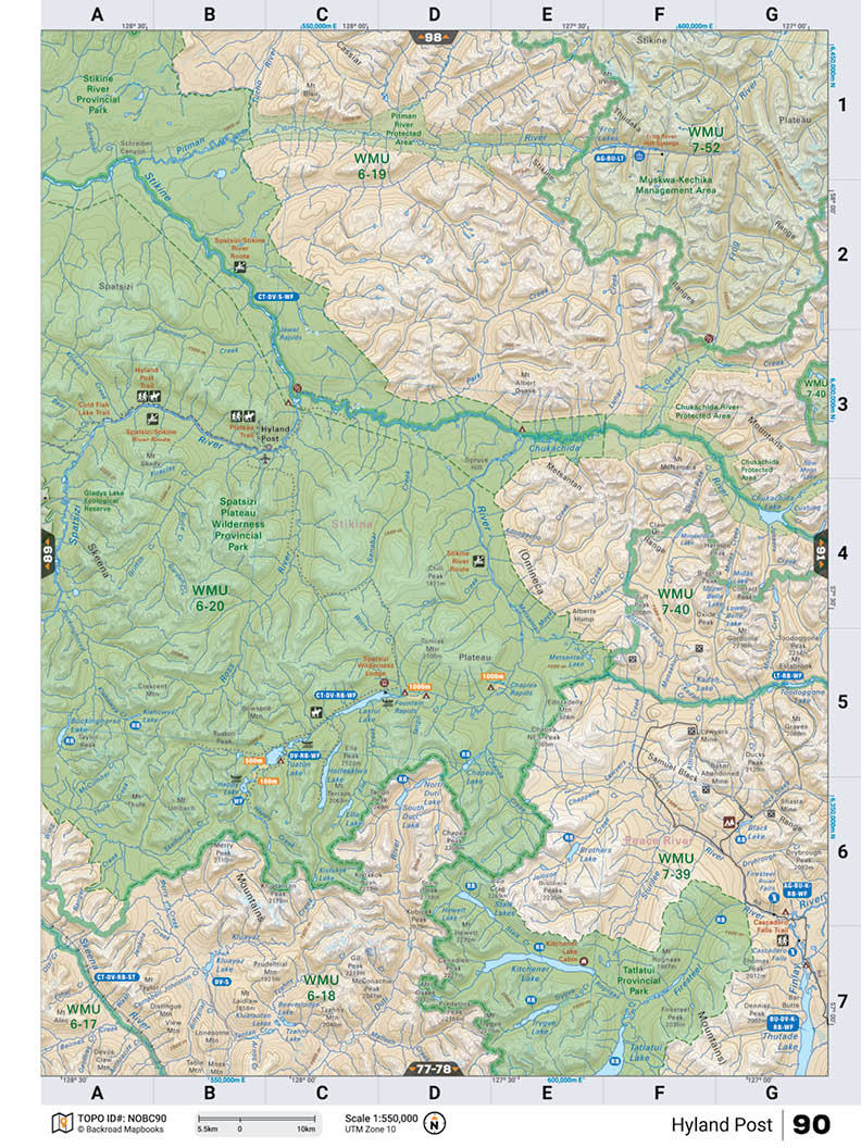 This recreation map for the Spatsizi Plateau Wilderness Provincial Park area highlights all the logging and resource roads, recreational features and trails for hiking, mountain biking, ATVing, snowmobiling, skiing, snowshoeing, fishing, camping, hunting, canoeing, kayaking, wildlife viewing and more. New features include private land and labelled fish species, plus new roads, recreational trails and Points of Interest. No other map for the area provides you with this level of recreational or topographic detail. Measuring 105 x 140 km (65 x 87 mi), this 1:185,000 scale map covers 14,750 km2 (5,695 mi2) in total and includes Spatsizi Plateau Wilderness Prov Park, Fountain Rapids, Tuaton Lake, Happy Lake, Stikine River, Muskwa-Kechika Management Area, Tatlatui Prov Park, Stikine Rover Prov Park, Chukachida River,Spatsizi River and more! This map also covers the following Wildlife Management Units: WMU 6-17 Skeena, WMU 6-18 Skeena, WMU 6-19 Skeena, WMU 6-20 Skeena, WMU 7-39 Omineca, WMU 7-40 Omineca, WMU 7-52 Peace. Spatsizi Plateau Wilderness Prov Park - Northern BC is printed on demand at our office in Coquitlam (BC) and measures 61 x 94 cm (24 x 37 inches).