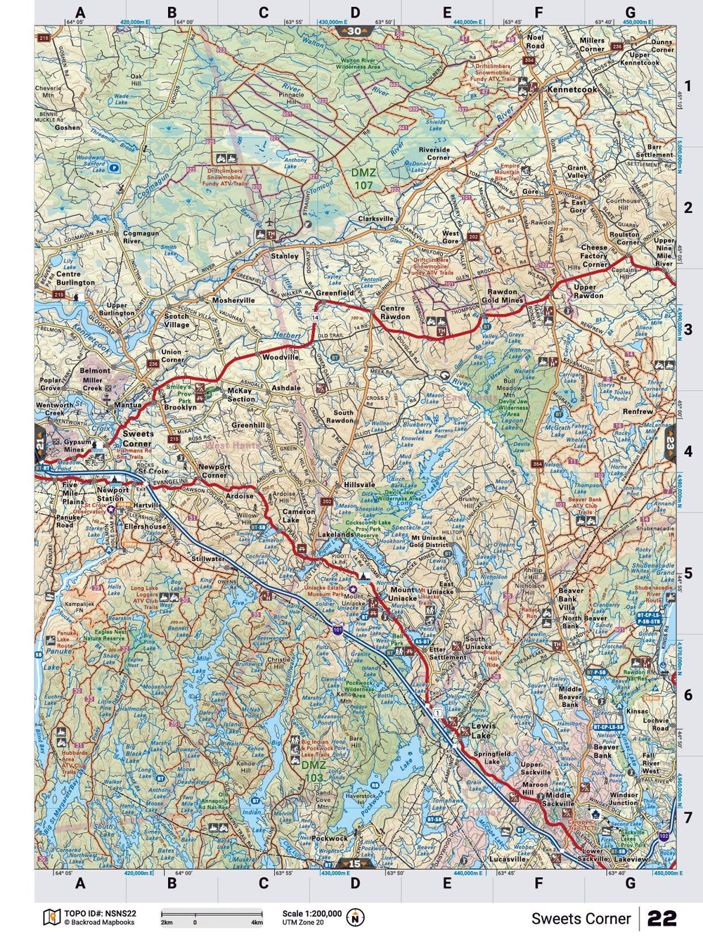This recreation topographic map for Sweets Corner highlights all the logging/resource roads, hunting areas, fishing lakes & streams, campsites, paddling routes for canoeing and kayaking, wildlife viewing areas, multi-use trails for hiking, biking, horseback riding, cross-country skiing and snowshoeing, motorized trails for ATVing and snowmobiling & more. Covering 1,925 km2 (745 mi2), this 1:65,000 scale map measures 38 x 50 km (24 x 31 mi), providing you with more topographic and recreational detail for the Yarmouth area than any other map on the market. Special features include the addition of Crown land areas and countless new roads, trails and recreational Points of Interest. Included on this map are Kennetcook, Sweets Corner, Lewis Lake, Beaver Bank, Pockwock Lake, Panuke Lake, Kennetcook River, Cogmagun River, Kinsac Lake, Middle Sackville and more!
