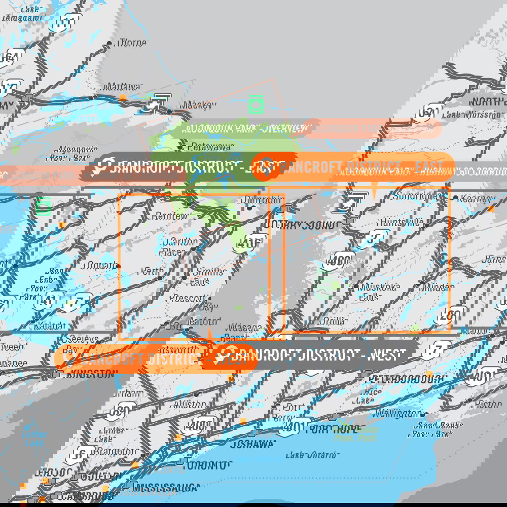 South of Ontario’s famous Algonquin Park lies some of Canada’s most verdant land, in a region known as the Bancroft district in the heart of cottage country. This detailed map includes the West Side of the Bancroft District Crown Land featuring Huntsville, Bracebridge, Gravenhurst, Queen Elizabeth II Wildlands Provincial Park, Muskoka Falls, Norland, Fenelon Falls, Bobcaygeon, Kawartha Highlands Provincial Park, Buckhorn, Gooderham, Haliburton, Minden, Bigwind Lake Provincial Park, Bancroft, Apsley and the backcountry beyond, where people come to play and end up wanting to stay.