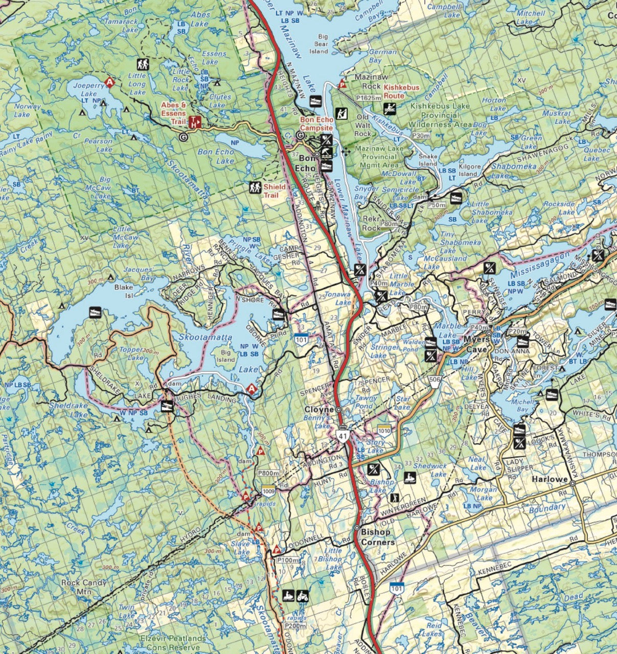 South of Ontario’s famous Algonquin Park lies some of Canada’s most verdant land, in a region known as the Bancroft district in the heart of cottage country. This detailed map includes the East Side of the Bancroft District Crown Land featuring Renfrew, Barry's Bay, Bancroft, Kaladar, Arden, Bon Echo, Denbigh, Griffith, Calabogie, Ompah, Carlton Place, Perth, Caladar, Westport and the backcountry beyond, where people come to play and end up wanting to stay.