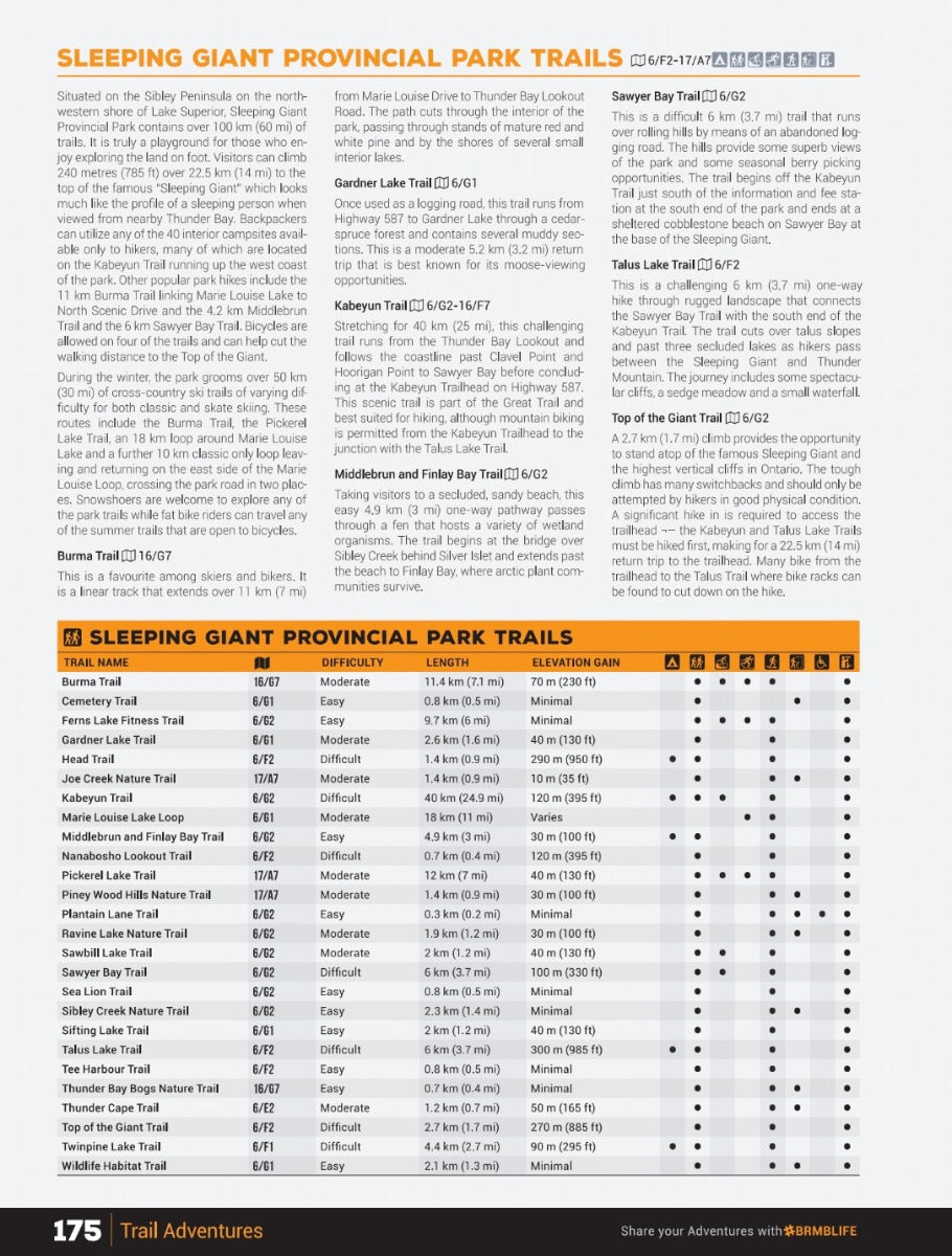 From urban walking trails in Thunder Bay to remote wilderness treks around Kenora, there is no shortage of trails to explore in northern Ontario. The Voyageur Trail and the Great/Trans Canada Trail offer some fantastic long distance hiking and biking options. In the latest edition of our Northwestern Ontario Backroad Mapbook you will find over 155 detailed trail descriptions, including access, distance, elevation gain, difficulty, highlights and more. Trail charts offer even more trail alternatives for Sleeping Giant and Quetico Provincial Parks, the Great/Trans Canada Trail and the Thunder Bay area.