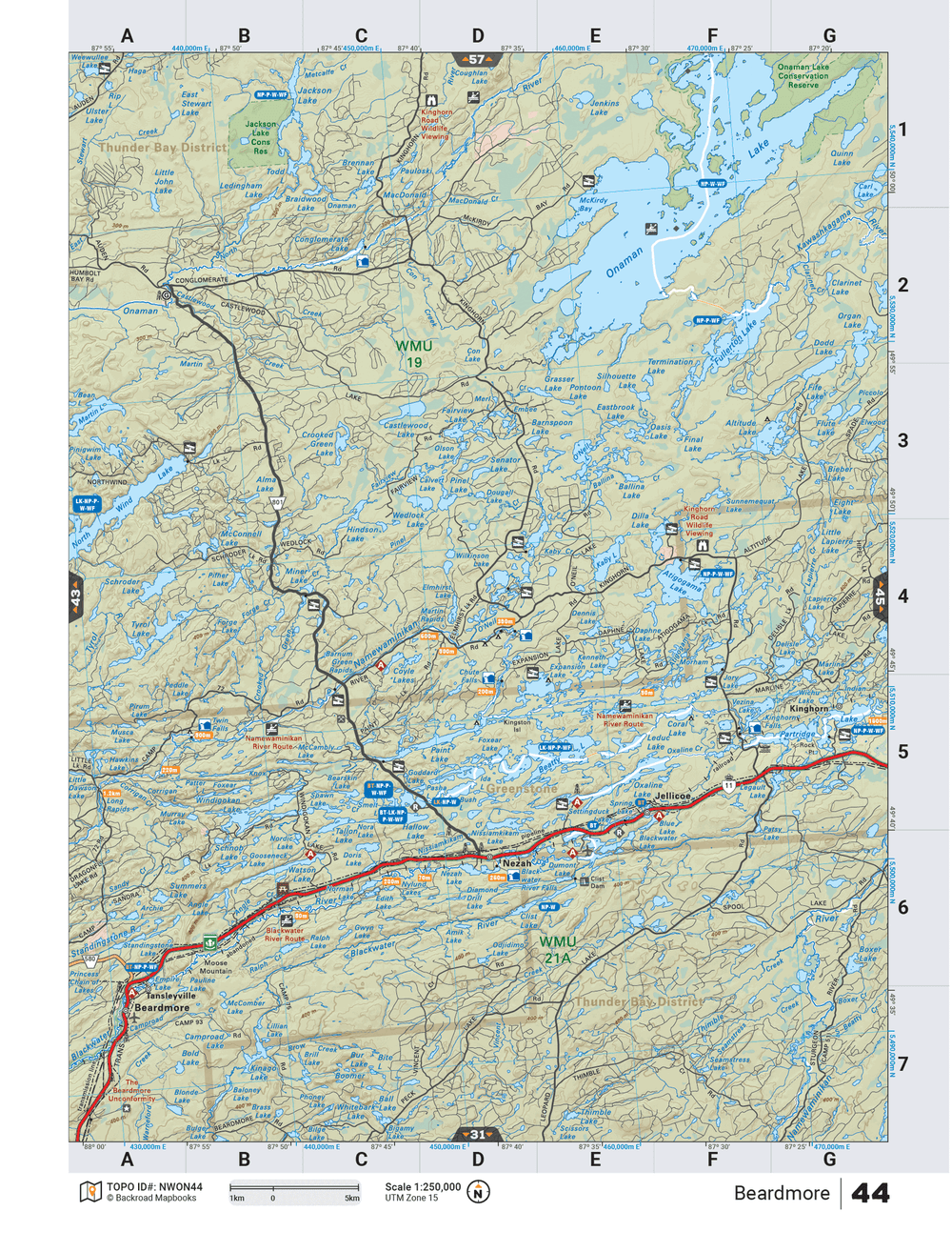 This recreation topographic map for Beardmore highlights all the logging/resource roads, hunting areas, fishing lakes & streams, campsites, paddling routes for canoeing and kayaking, wildlife viewing areas, multi-use trails for hiking, biking, horseback riding, cross-country skiing and snowshoeing, motorized trails for ATVing and snowmobiling & more. Covering 3,040 km2 (1,175 mi2), this 1:85,000 scale map measures 48 x 63.5 km (30 x 39.5 mi), providing you with more topographic and recreational detail than any other map on the market. New features include expanded road and trail data and countless recreational Points of Interest. Included on this map are Beardmore, Onaman Lake, Namewaminikan River, Blackwater River, North Wind Lake, Partridge Lake, Onaman Lake Conservation Area and more!
