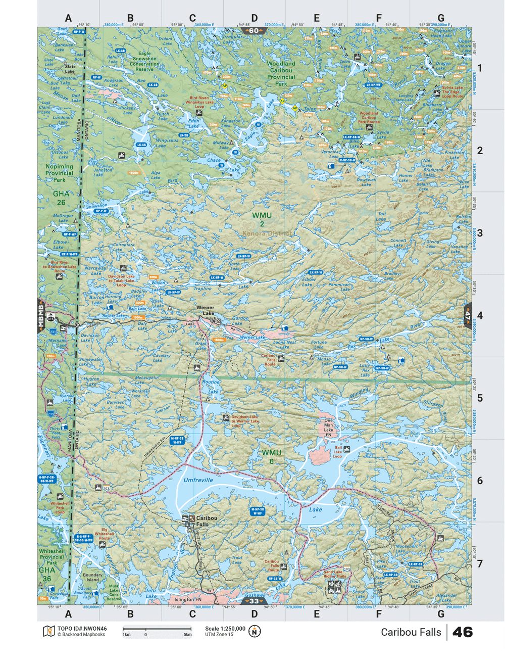 This recreation topographic map for Caribou Falls highlights all the logging/resource roads, hunting areas, fishing lakes & streams, campsites, paddling routes for canoeing and kayaking, wildlife viewing areas, multi-use trails for hiking, biking, horseback riding, cross-country skiing and snowshoeing, motorized trails for ATVing and snowmobiling & more. Covering 3,040 km2 (1,175 mi2), this 1:85,000 scale map measures 48 x 63.5 km (30 x 39.5 mi), providing you with more topographic and recreational detail than any other map on the market. New features include expanded road and trail data and countless recreational Points of Interest. Included on this map are Caribou Falls, Nopiming Provincial Park, Woodland Caribou Provincial Park, Whiteshell Provincial Park, Umfreville Lake, Trapline Lake, Elbow Lake and more!
