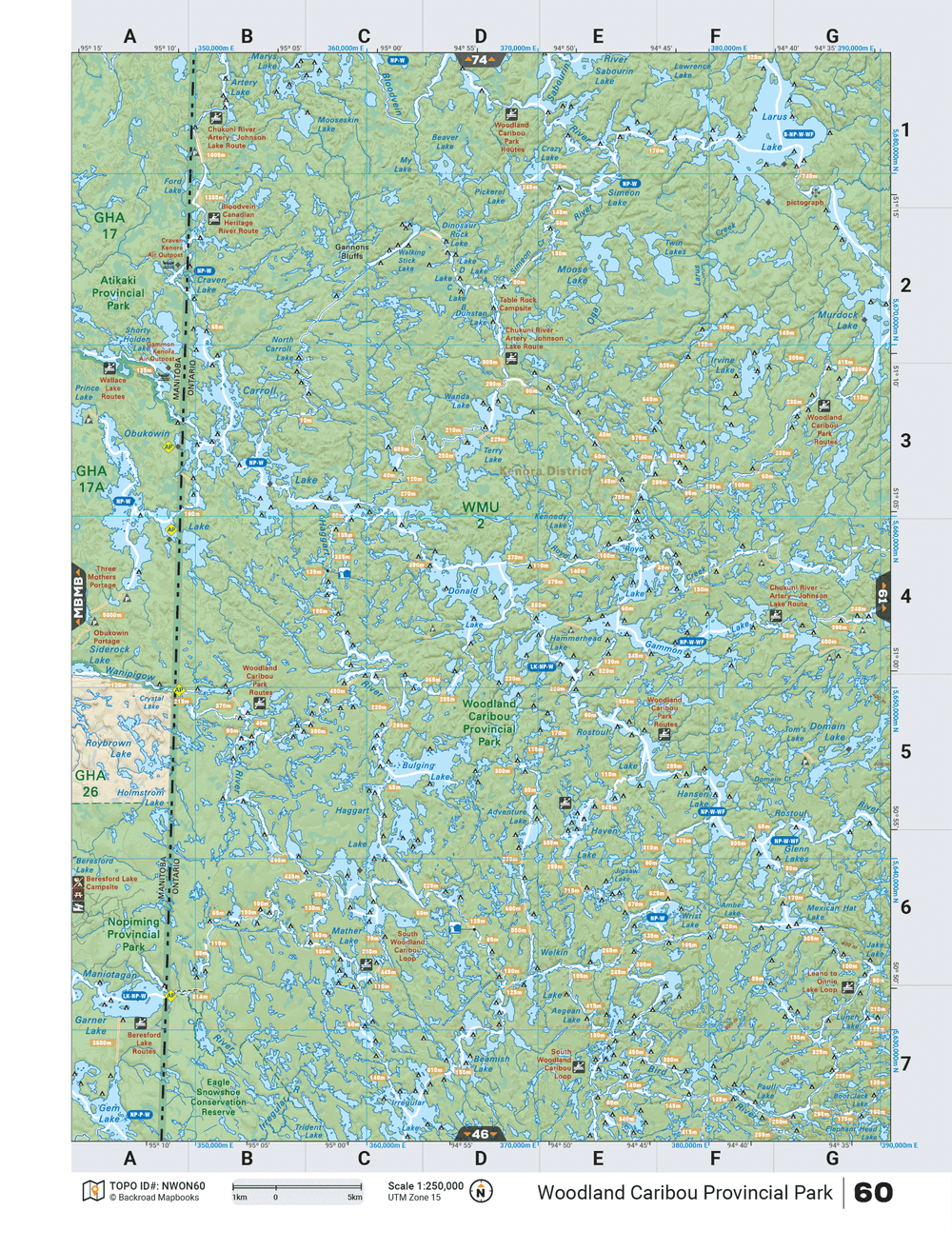 This recreation topographic map for Woodland Caribou Provincial ParkÊ highlights all the logging/resource roads, hunting areas, fishing lakes & streams, campsites, paddling routes for canoeing and kayaking, wildlife viewing areas, multi-use trails for hiking, biking, horseback riding, cross-country skiing and snowshoeing, motorized trails for ATVing and snowmobiling & more. Covering 3,040 km2 (1,175 mi2), this 1:85,000 scale map measures 48 x 63.5 km (30 x 39.5 mi), providing you with more topographic and recreational detail than any other map on the market. New features include expanded road and trail data and countless recreational Points of Interest. Included on this map are Woodland Caribou Provincial Park, Larus Lake, Gammon Lake, Bulging Lake, Haggart River, Carroll Lake, Bloodvein River, Donald Lake, Bird River and more!
