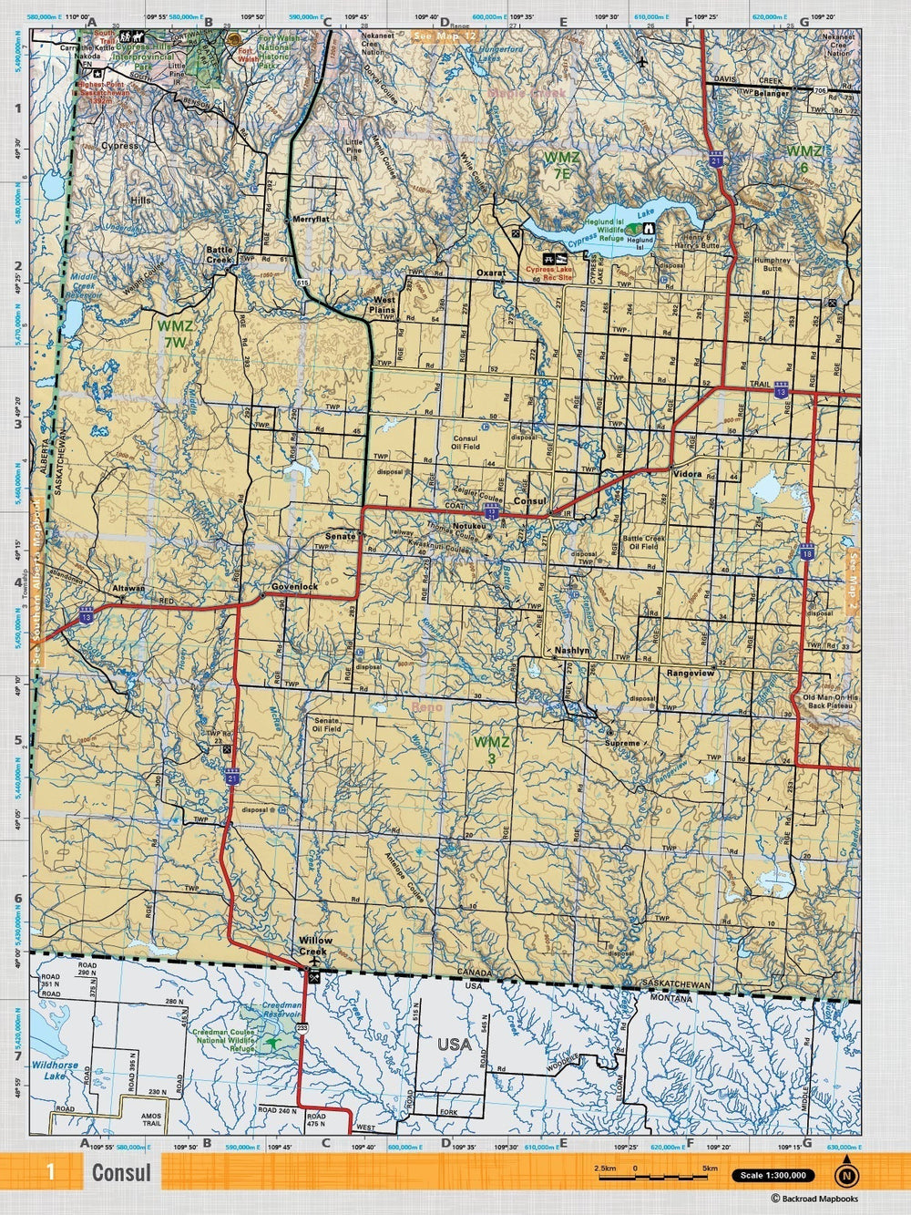 This recreation topographic map for the Consul area highlights all the logging and resource roads, multi-use trails for hikers, mountain bikers, horseback riders, cross-country skiers and snowshoers, motorized trails for ATVers and snowmobilers, fishing lakes and rivers, recreation areas, campgrounds, day-use areas, viewpoints, backcountry campsites, work camps, oil & gas sites and more. No other map for the area provides you with this level of recreational or topographic detail. Covering 4,450 km2 (1,620 mi2) in total, this 1:100,000 scale map measures 58 x 77 km (36 x 48 mi). Special features include the addition of Oil & Gas information including gas plants, disposal and compressor stations and updated seismic line corridors, the addition of Municipal Regional District Boundaries, new lake data and more. This map includes Altawan, Battle Creek, Belanger, Consul, Cypress Lake, Cypress Hills Interprovincial Park, Fort Walsh National Historic Site, Heglund Island Wildlife Refuge, Nashlyn, Old Man on His Back Plateau, Rangeview and more!