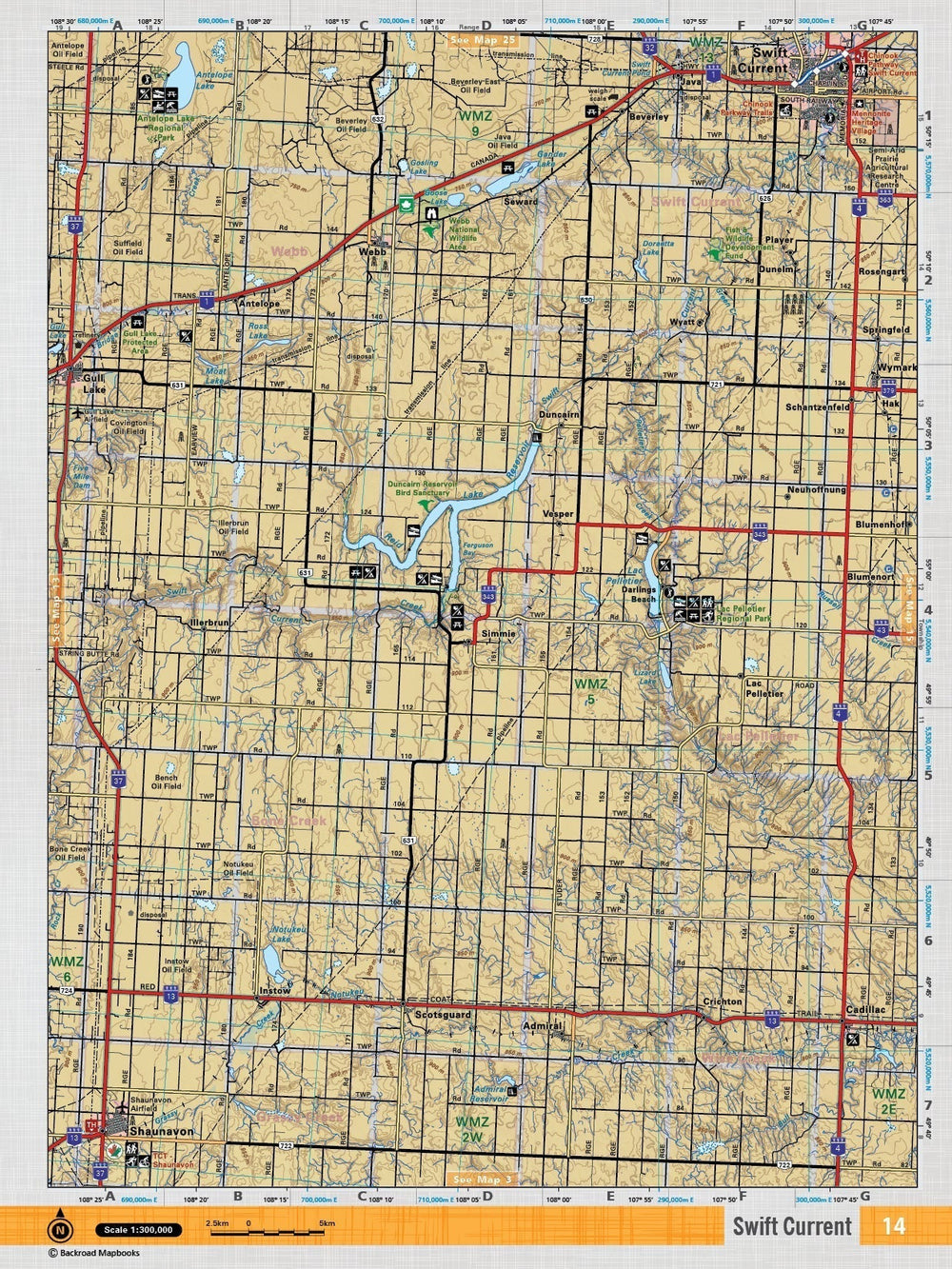 This recreation topographic map for the Swift Current area highlights all the logging and resource roads, multi-use trails for hikers, mountain bikers, horseback riders, cross-country skiers and snowshoers, motorized trails for ATVers and snowmobilers, fishing lakes and rivers, recreation areas, campgrounds, day-use areas, viewpoints, backcountry campsites, work camps, oil & gas sites and more. No other map for the area provides you with this level of recreational or topographic detail. Covering 4,450 km2 (1,620 mi2) in total, this 1:100,000 scale map measures 58 x 77 km (36 x 48 mi). Special features include the addition of Oil & Gas information including gas plants, disposal and compressor stations and updated seismic line corridors, the addition of Municipal Regional District Boundaries, new lake data and more. This map includes Swift Current, Antalope Lake, Gardner Lake, Reid Lake Reservoir, Swift Current Creek, Lac Pelletier, Lac Pelletier Regional Park and more!