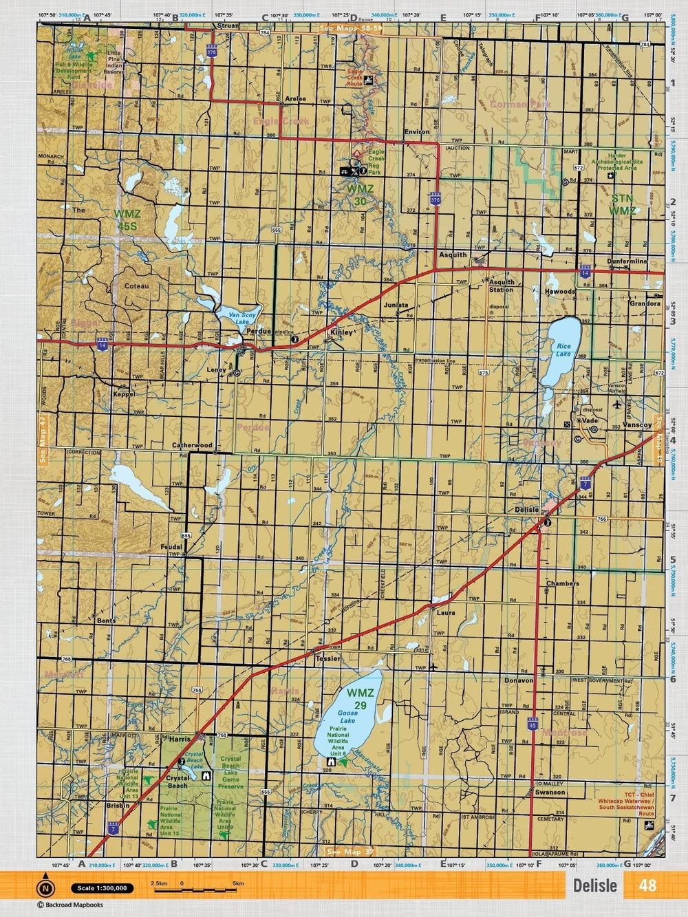 This recreation topographic map for the Delisle area highlights all the logging and resource roads, multi-use trails for hikers, mountain bikers, horseback riders, cross-country skiers and snowshoers, motorized trails for ATVers and snowmobilers, fishing lakes and rivers, recreation areas, campgrounds, day-use areas, viewpoints, backcountry campsites, work camps, oil & gas sites and more. No other map for the area provides you with this level of recreational or topographic detail. Covering 4,450 km2 (1,620 mi2) in total, this 1:100,000 scale map measures 58 x 77 km (36 x 48 mi). Special features include the addition of Oil & Gas information including gas plants, disposal and compressor stations and updated seismic line corridors, the addition of Municipal Regional District Boundaries, new lake data and more. This map includes Delisle, Eagle Creek, Eagle Creek Regional Park, Van Scoy Lake, Goose Lake, Crystal Beach Lake Game Preserve, Rice Lake and more!