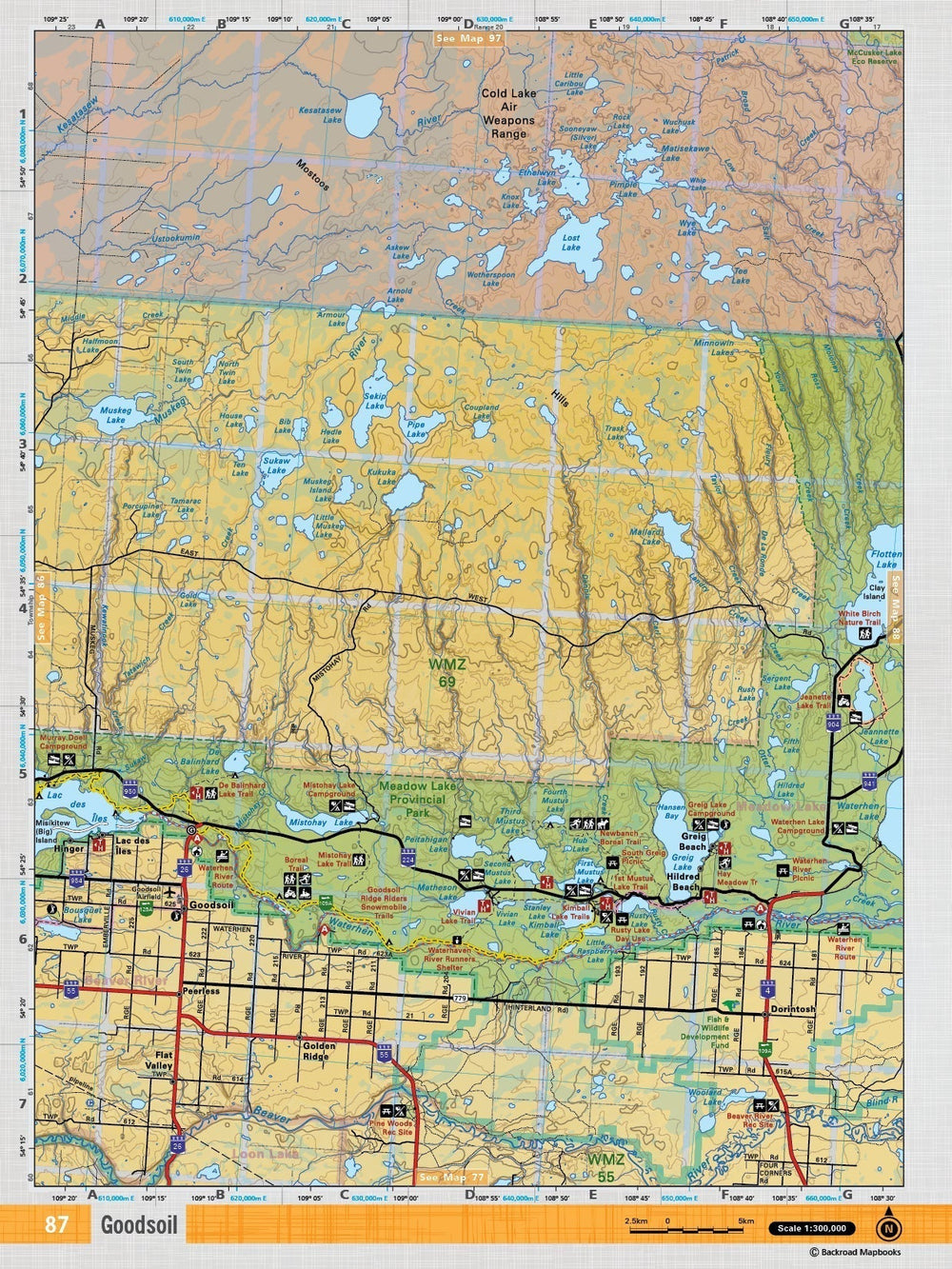 This recreation topographic map for the Goodsoil area highlights all the logging and resource roads, multi-use trails for hikers, mountain bikers, horseback riders, cross-country skiers and snowshoers, motorized trails for ATVers and snowmobilers, fishing lakes and rivers, recreation areas, campgrounds, day-use areas, viewpoints, backcountry campsites, work camps, oil & gas sites and more. No other map for the area provides you with this level of recreational or topographic detail. Covering 4,450 km2 (1,620 mi2) in total, this 1:100,000 scale map measures 58 x 77 km (36 x 48 mi). Special features include the addition of Oil & Gas information including gas plants, disposal and compressor stations and updated seismic line corridors, the addition of Municipal Regional District Boundaries, new lake data and more. This map includes Goodsoil, Meadow Lake Provincial Park, Flotten Lake, Greig Lake, First Mustus Lake, Waterhen River, Lac des Iles, Mistohay Lake, Beaver River and more!