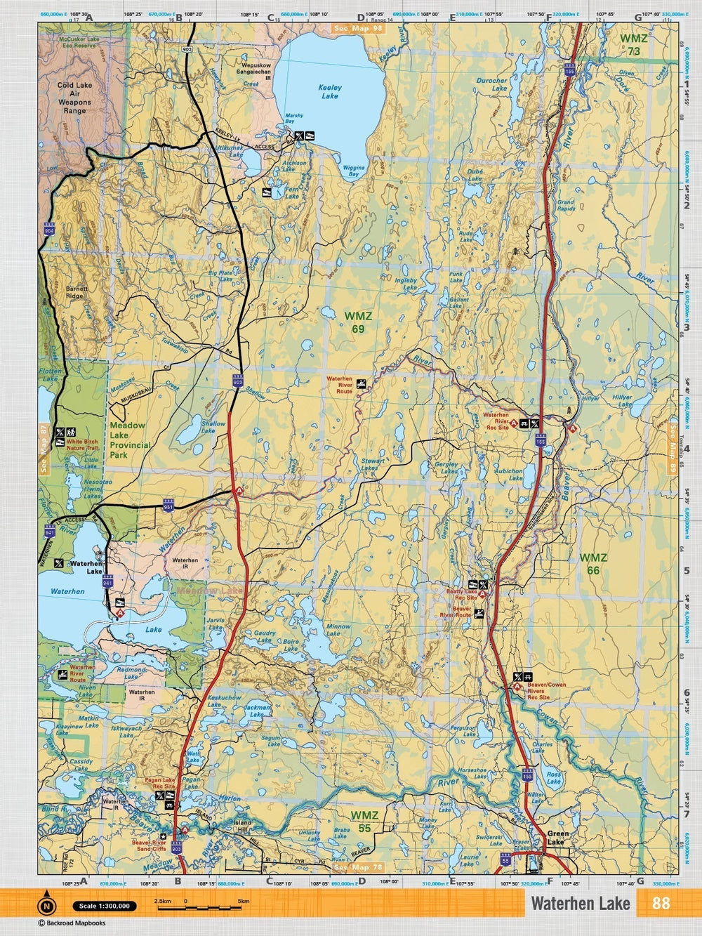 This recreation topographic map for the Waterhen Lake area highlights all the logging and resource roads, multi-use trails for hikers, mountain bikers, horseback riders, cross-country skiers and snowshoers, motorized trails for ATVers and snowmobilers, fishing lakes and rivers, recreation areas, campgrounds, day-use areas, viewpoints, backcountry campsites, work camps, oil & gas sites and more. No other map for the area provides you with this level of recreational or topographic detail. Covering 4,450 km2 (1,620 mi2) in total, this 1:100,000 scale map measures 58 x 77 km (36 x 48 mi). Special features include the addition of Oil & Gas information including gas plants, disposal and compressor stations and updated seismic line corridors, the addition of Municipal Regional District Boundaries, new lake data and more. This map includes Waterhen Lake, Keeley Lake, Durocher Lake, Beaver River, Meadow Lake Provincial Park, Cowan River, Ross Lake, Minnow Lake and more!
