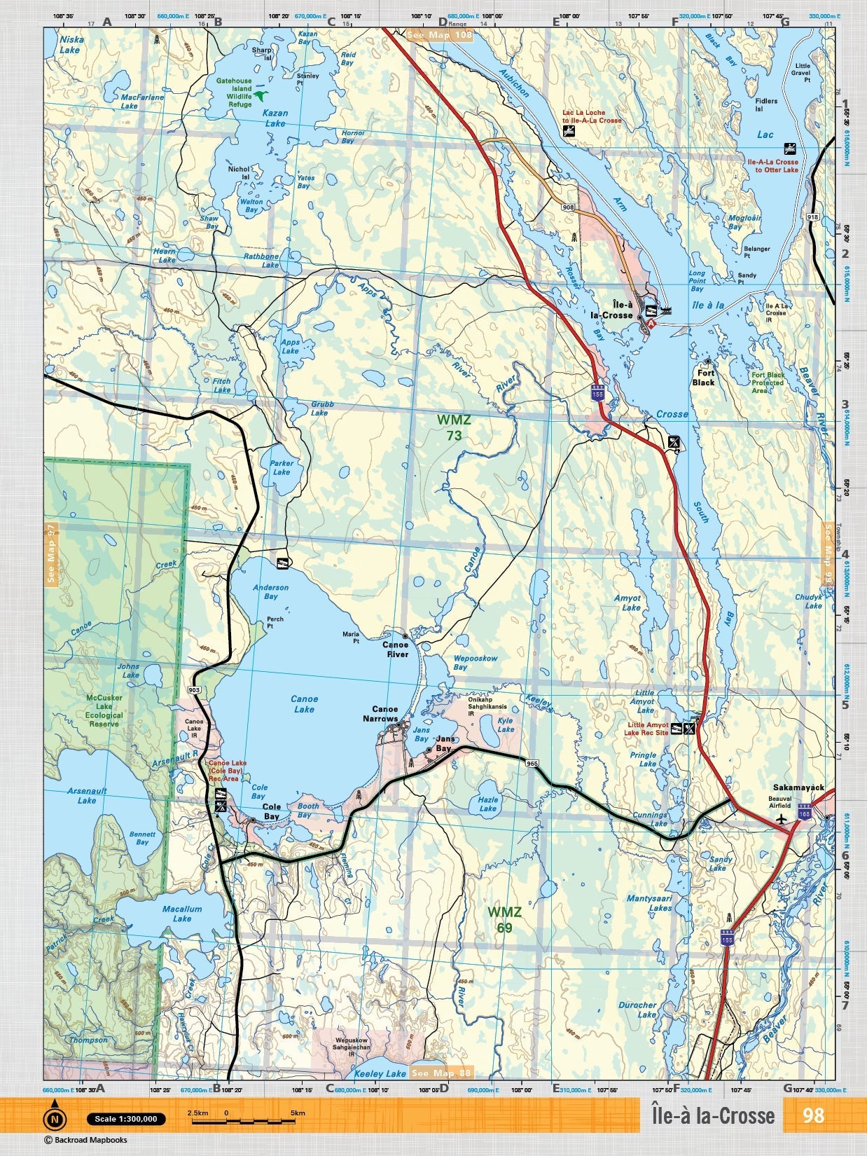 This recreation topographic map for the Ile-a la-Crosse area highlights all the logging and resource roads, multi-use trails for hikers, mountain bikers, horseback riders, cross-country skiers and snowshoers, motorized trails for ATVers and snowmobilers, fishing lakes and rivers, recreation areas, campgrounds, day-use areas, viewpoints, backcountry campsites, work camps, oil &...