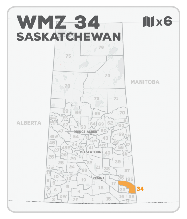 This hunting map bundle includes six individual topographic maps covering this zone. Printed at a 1:100,000 scale, these maps feature clearly marked Wildlife Management Zones, along with fish and wildlife areas and township and range road systems. Updated road and trail systems, recreational points of interest, campsites and more make these the most detailed hunting maps available on the market. WMZ 34 is located south of Grenfell and Moosomin, with the Trans-Canada Highway in the north, Highway 47 & 48 in the west, Highway 13 in the south and the Manitoba border in the east acting as boundaries.