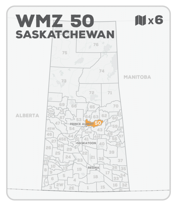 This hunting map bundle includes six individual topographic maps covering this zone. Printed at a 1:100,000 scale, these maps feature clearly marked Wildlife Management Zones, along with fish and wildlife areas and township and range road systems. Updated road and trail systems, recreational points of interest, campsites and more make these the most detailed hunting maps available on the market. WMZ 50 is located northeast of Prince Albert, running along the Saskatchewan River east to Nipawin in the south and Highway 2 north to Christopher Lake in the west.