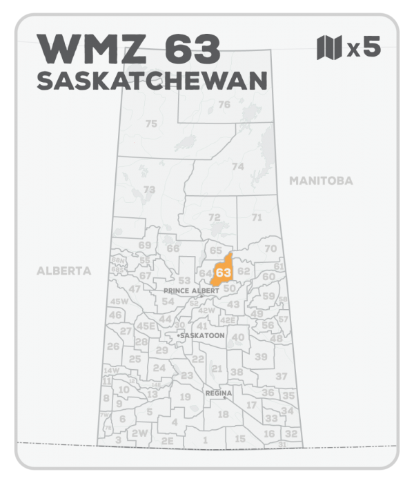 This hunting map bundle includes five individual topographic maps covering this zone. Printed at a 1:100,000 scale, these maps feature clearly marked Wildlife Management Zones, along with fish and wildlife areas and township and range road systems. Updated road and trail systems, recreational points of interest, campsites and more make these the most detailed hunting maps available on the market. WMZ 63 covers the area around Narrow Hills Provincial Park, with Candle Lake and Highways 120, 913 & 106 forming the western and northern boundaries and township grids forming the east and southern boundaries.