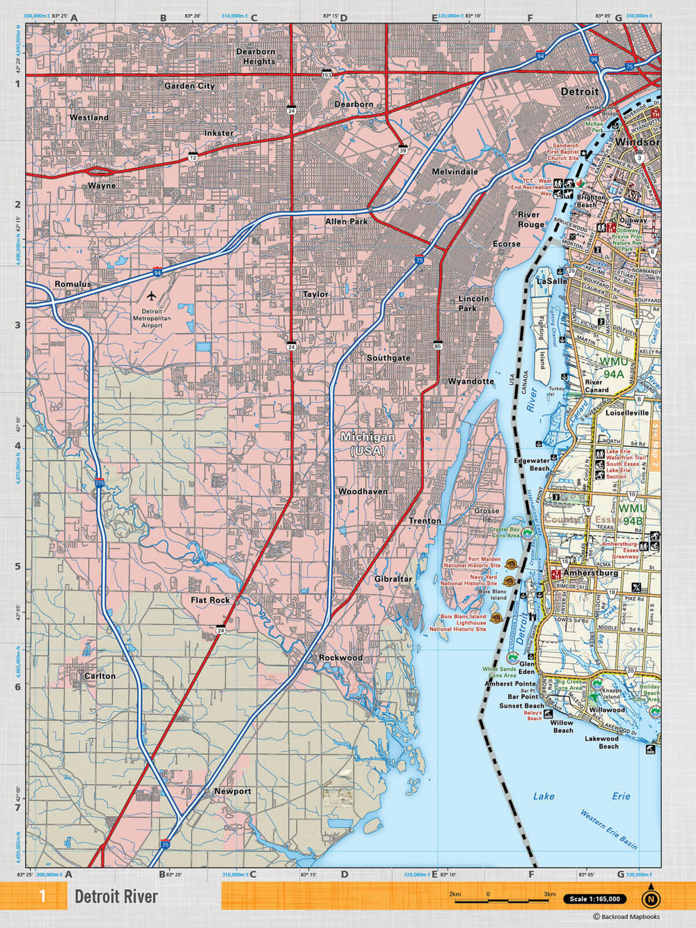 This recreation topographic map for Detroit River highlights all the logging/resource roads, hunting areas, fishing lakes & streams, campsites, paddling routes for canoeing and kayaking, wildlife viewing areas, multi-use trails for hiking, biking, horseback riding, cross-country skiing and snowshoeing, motorized trails for ATVing and snowmobiling & more. Covering 1,325 km2 (510 mi2), this 1:55,000 scale map measures 31.5 x 42 km (19.5 x 26 mi), providing you with more topographic and recreational detail for the Detroit River area than any other map on the market. New features include expanded road and trail data and countless recreational Points of Interest. Included on this map are Amhertsburg, Edgewater Beach, La Salle, Lakewood Beach, Lake Erie, Loiselleville, Willow Beach, Windsor and parts of Michigan, including Detroit.