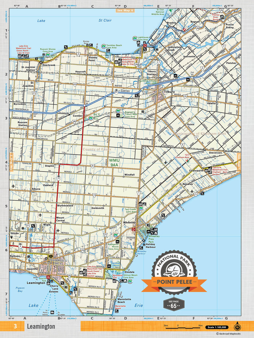 This recreation topographic map for Leamington highlights all the logging/resource roads, hunting areas, fishing lakes & streams, campsites, paddling routes for canoeing and kayaking, wildlife viewing areas, multi-use trails for hiking, biking, horseback riding, cross-country skiing and snowshoeing, motorized trails for ATVing and snowmobiling & more. Covering 1,325 km2 (510 mi2), this 1:55,000 scale map measures 31.5 x 42 km (19.5 x 26 mi), providing you with more topographic and recreational detail for the Detroit River area than any other map on the market. New features include expanded road and trail data and countless recreational Points of Interest. Included on this map are Leamington, Lake Erie, Lake St Clair, Wheatley Provincial Park, Thames River, Tilbury, Jeannettes Creek, Baptiste Creek and more!