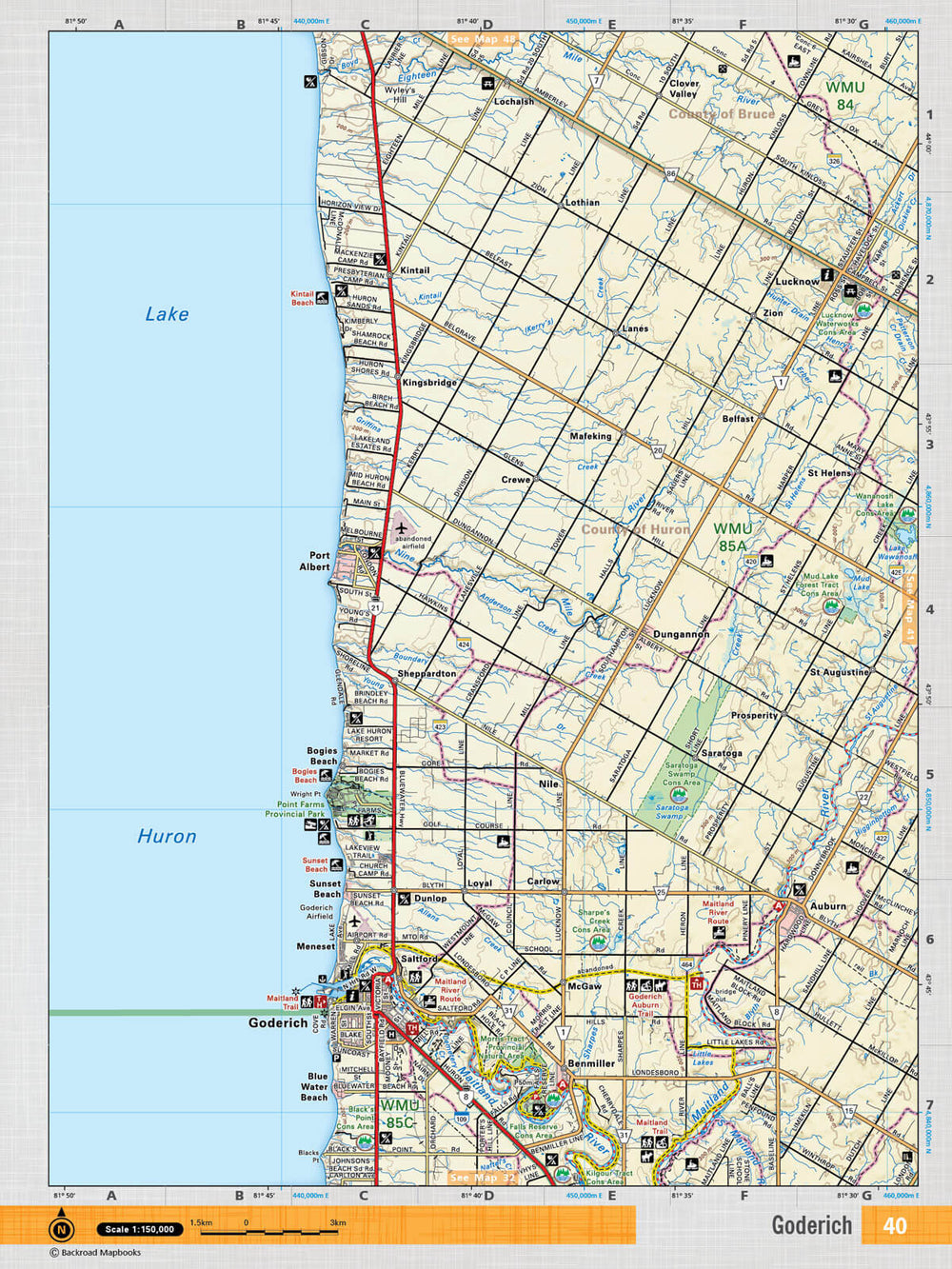 This recreation topographic map for Goderich highlights all the logging/resource roads, hunting areas, fishing lakes & streams, campsites, paddling routes for canoeing and kayaking, wildlife viewing areas, multi-use trails for hiking, biking, horseback riding, cross-country skiing and snowshoeing, motorized trails for ATVing and snowmobiling & more. Covering 1,090 km2 (420 mi2), this 1:50,000 scale map measures 29 x 38 km (18 x 24 mi), providing you with more topographic and recreational detail for the Niagara-on-the-Lake area than any other map on the market. New features include expanded road and trail data and countless recreational Points of Interest. Included on this map are Lake Huron, Goderich, Port Albert, Auburn, Maitland River, Benmiller, Point Farms Provincial Park, Lucknow, Saratoga, Dungannon and more.
