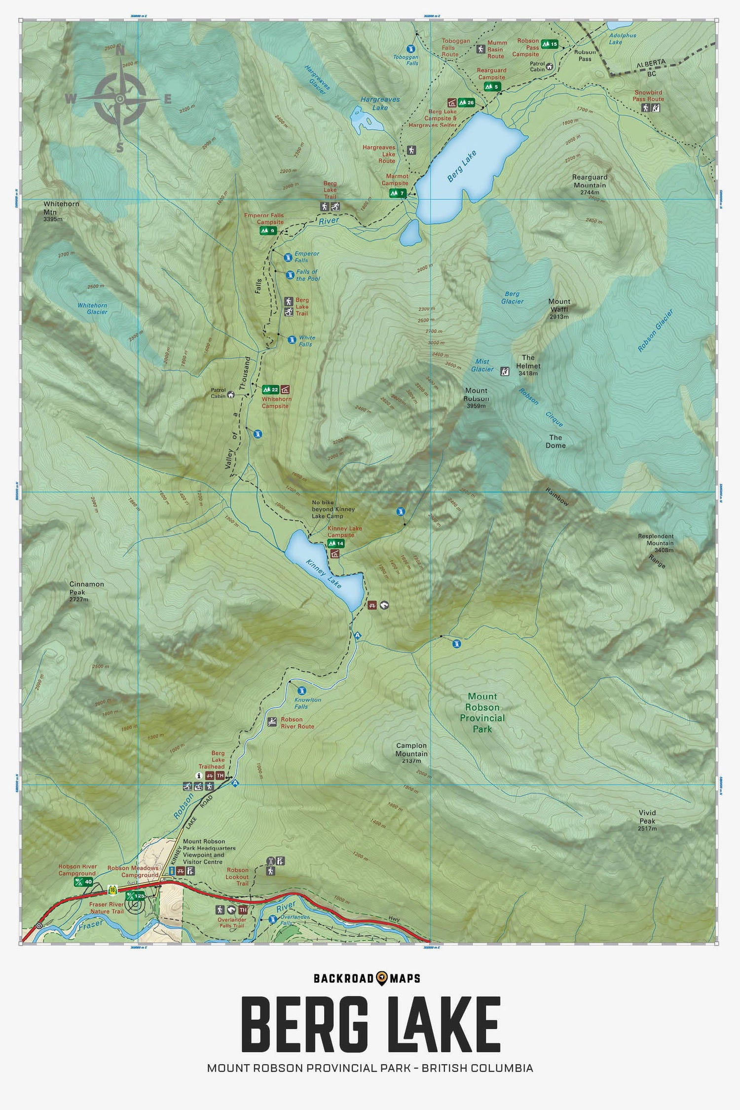 Focusing on the Berg Lake area of Mount Robson Provincial Park, this BRMB Adventure topographic map shows you all the nearby access roads, trails for hiking, cross-country skiing and mountain biking, campgrounds, backcountry campsites and shelters, fishing lakes and rivers, viewpoints, waterfalls and more! This Adventure map features our industry leading topographic contours and relief shading and includes the areas of Berg Lake, Campion Mountain, Cinnamon Peak, Emperor Falls, Fraser River, Hargreaves Lake, Kinney Lake, Mount Robson, Overlander Falls, Rearguard Mountain, Robson River, the Park Visitor Centre and more!