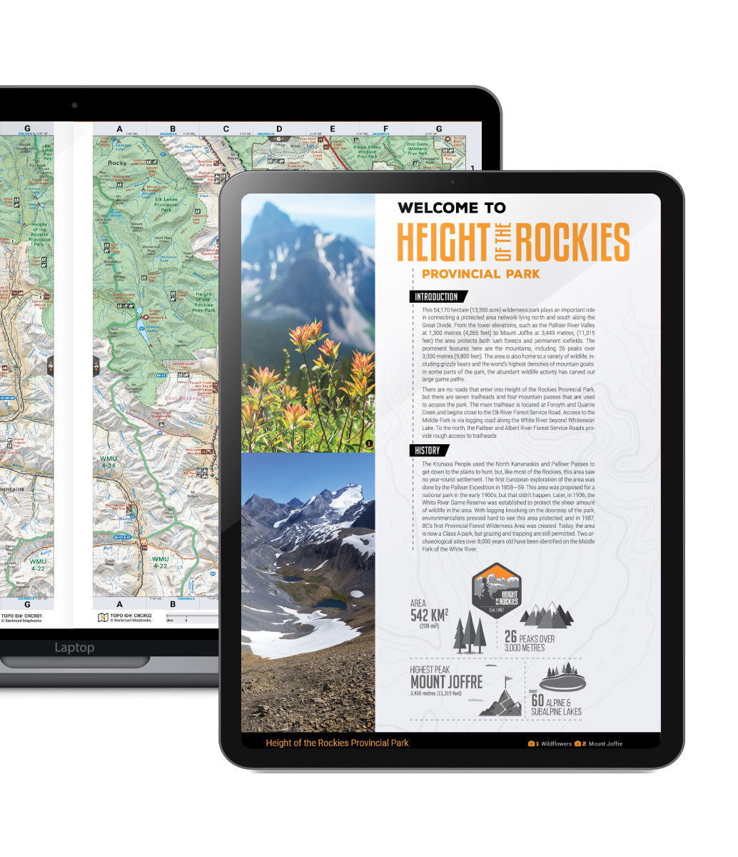 The PDF booklets are zoomable for easier reading of small text, lightweight and easily carried with you. Featuring all of the park information found in the Canadian Rockies Backroad Mapbook in one downloadable booklet, they are a must have on any park adventure. Features include: